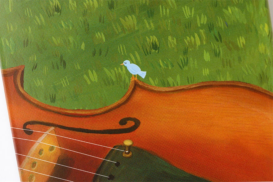 同じく裏表紙には、大きなバイオリンと小さな青い鳥。