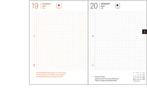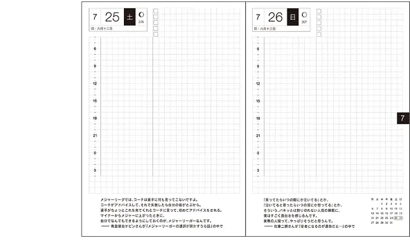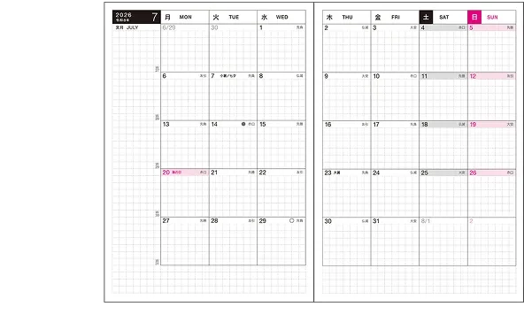 | 記載される内容 | 日番号/週番号(月間カレンダーと1日ページに記載)/月の満ち欠け(1日ページ全ページに記載・月間カレンダーに満月と新月のみ記載) |