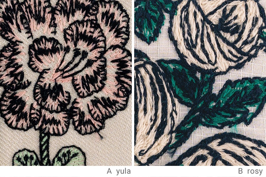 刺繍を幾重にも重ねて油彩画のように表現されたバラ。