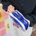 ビビッドな青とファスナー部分の白を組み合わせ、