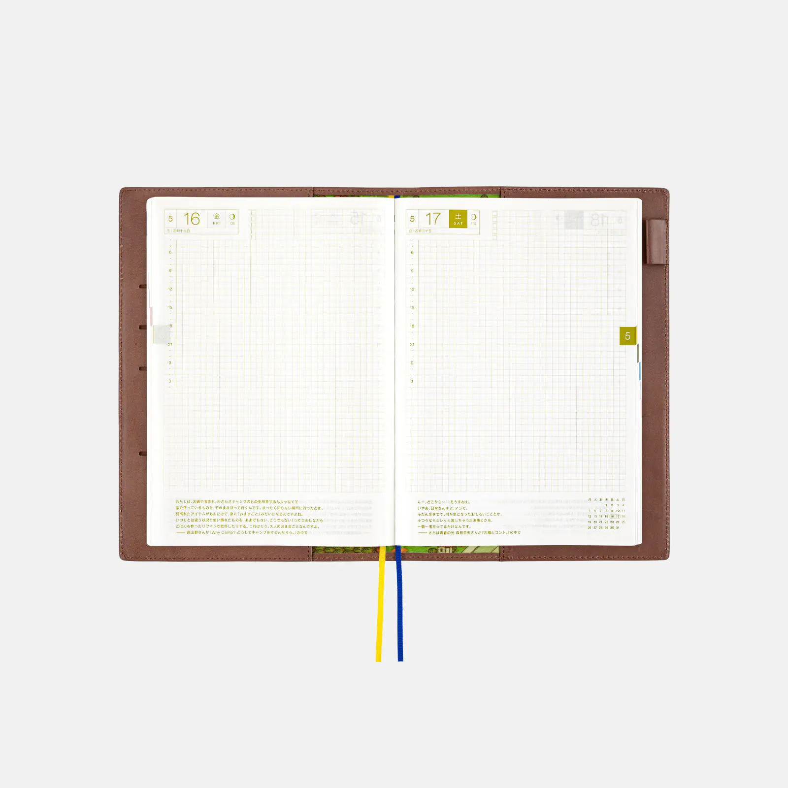 | 記載される内容 | 日番号/週番号(月間カレンダー・週間ダイアリーに記載)/月の満ち欠け(1日ページ全ページに記載、月間カレンダー・週間ダイアリーに満月と新月のみ記載) |