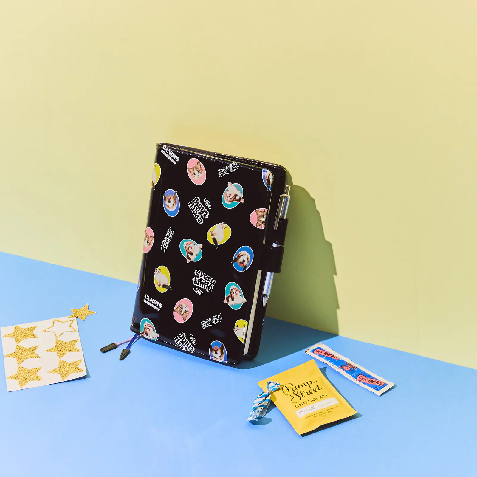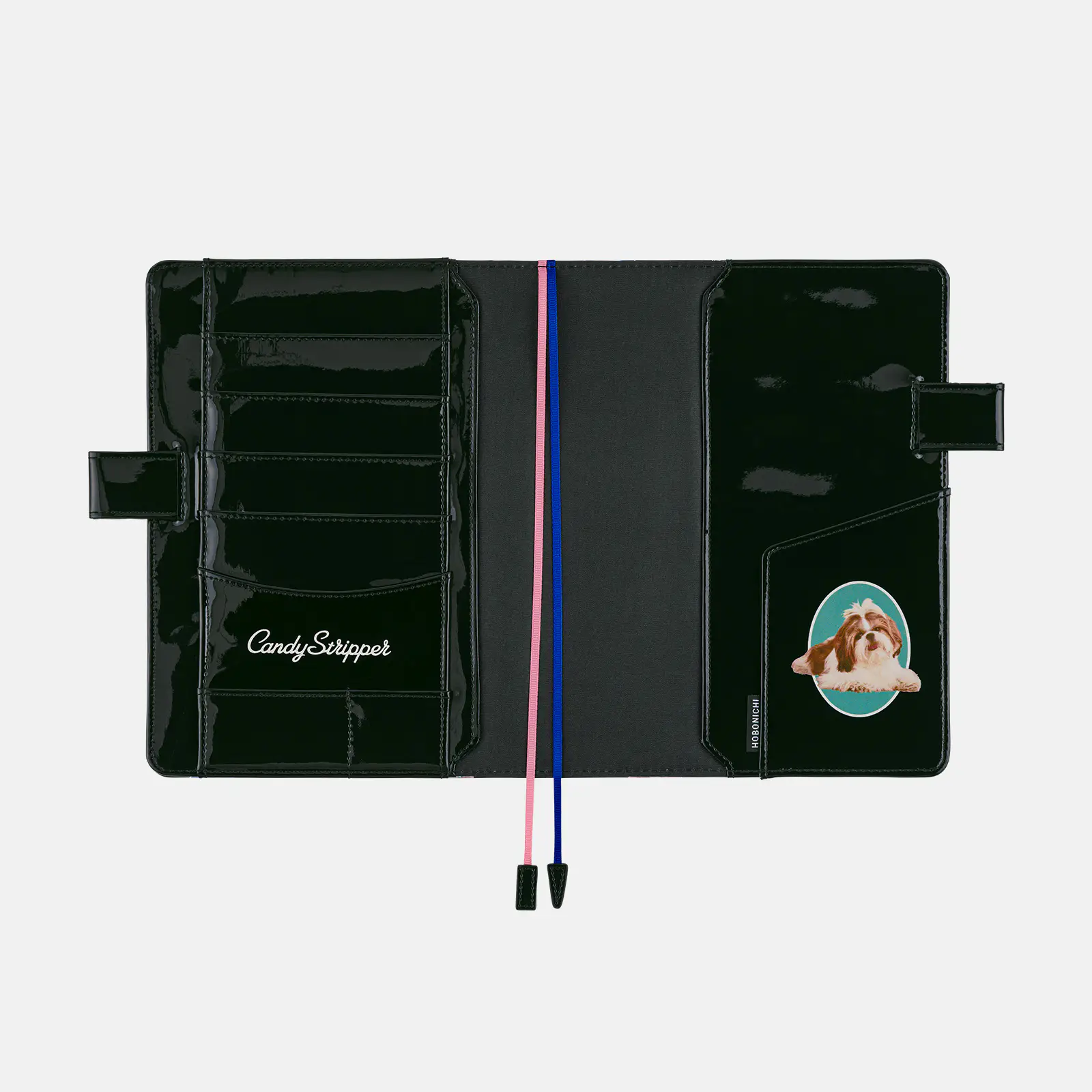 光沢のあるエナメル素材に犬と猫の写真をちりばめた、