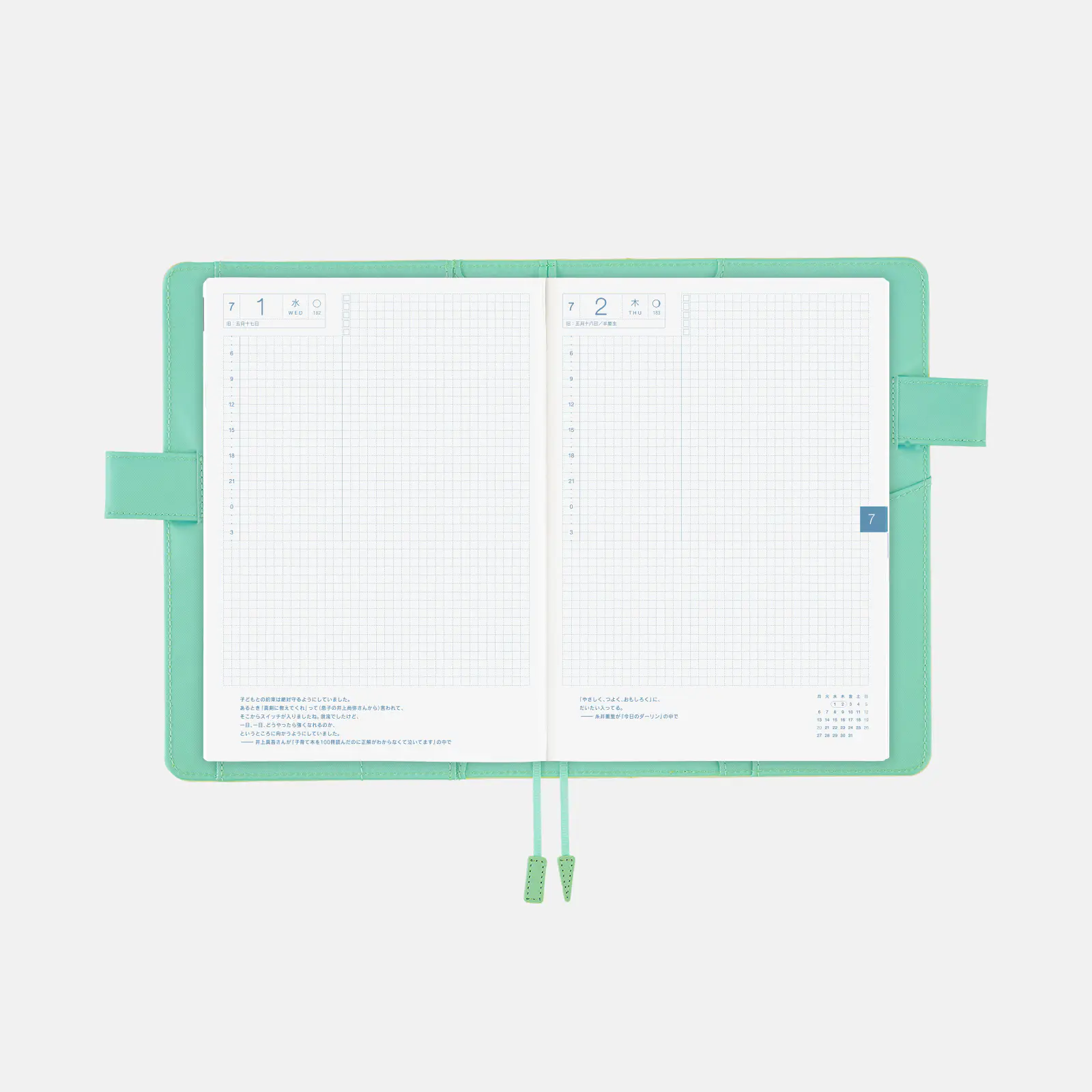 | 記載される内容 | 日番号/週番号(月間カレンダー・週間ダイアリーに記載)/月の満ち欠け(1日ページ全ページに記載、月間カレンダー・週間ダイアリーに満月と新月のみ記載) |