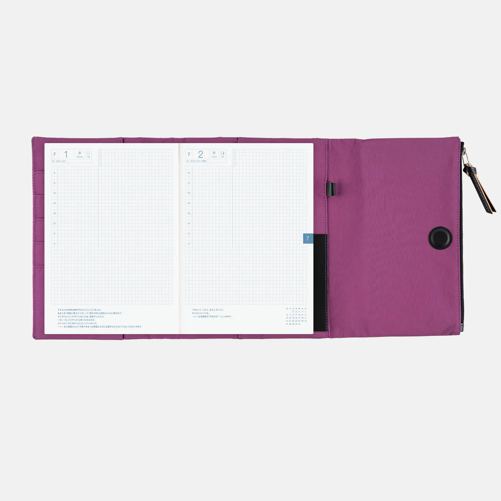 | 記載される内容 | 日番号/週番号(月間カレンダー・週間ダイアリーに記載)/月の満ち欠け(1日ページ全ページに記載、月間カレンダー・週間ダイアリーに満月と新月のみ記載) |