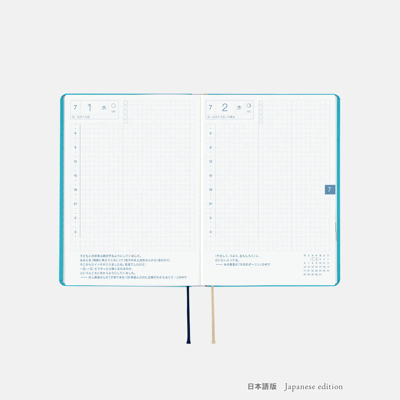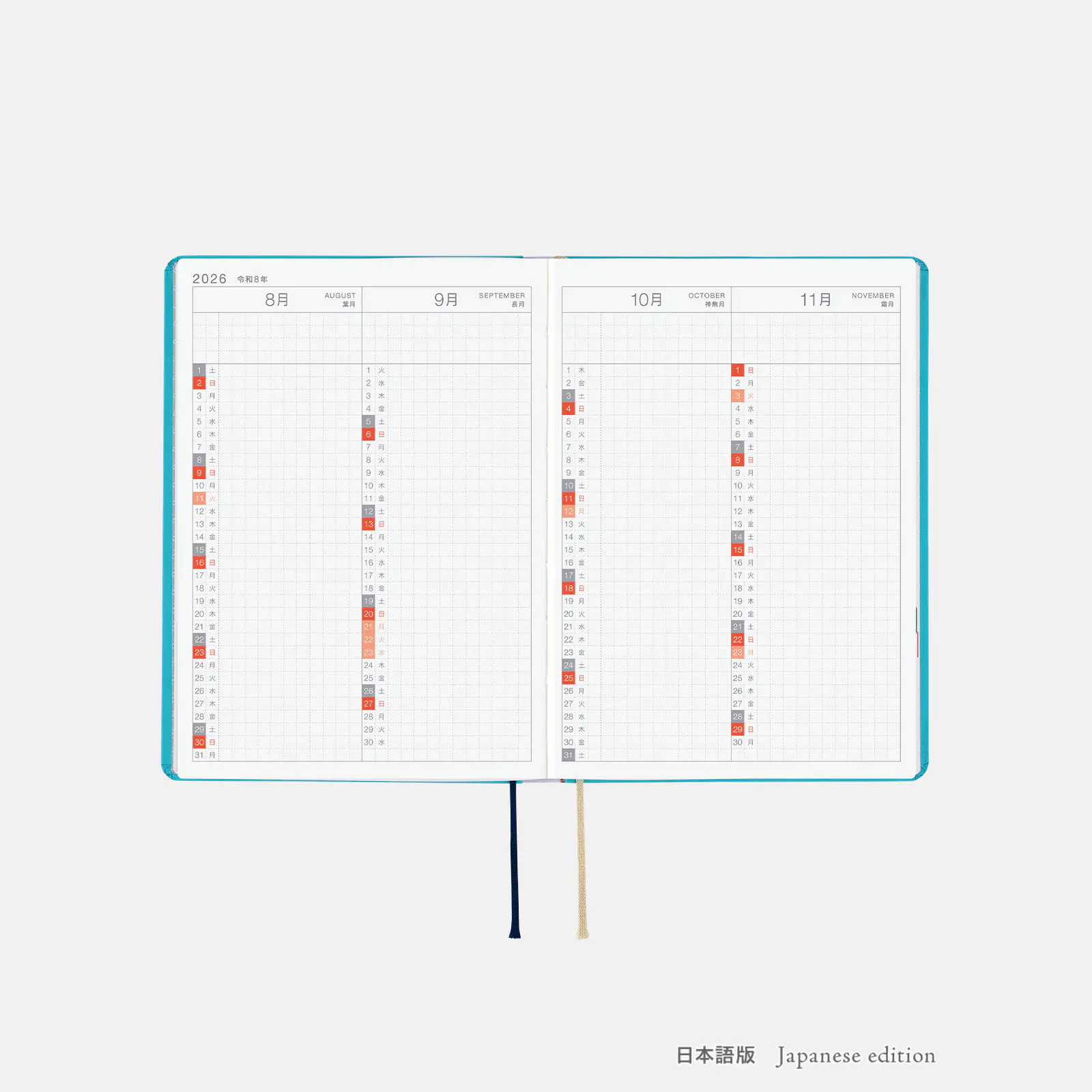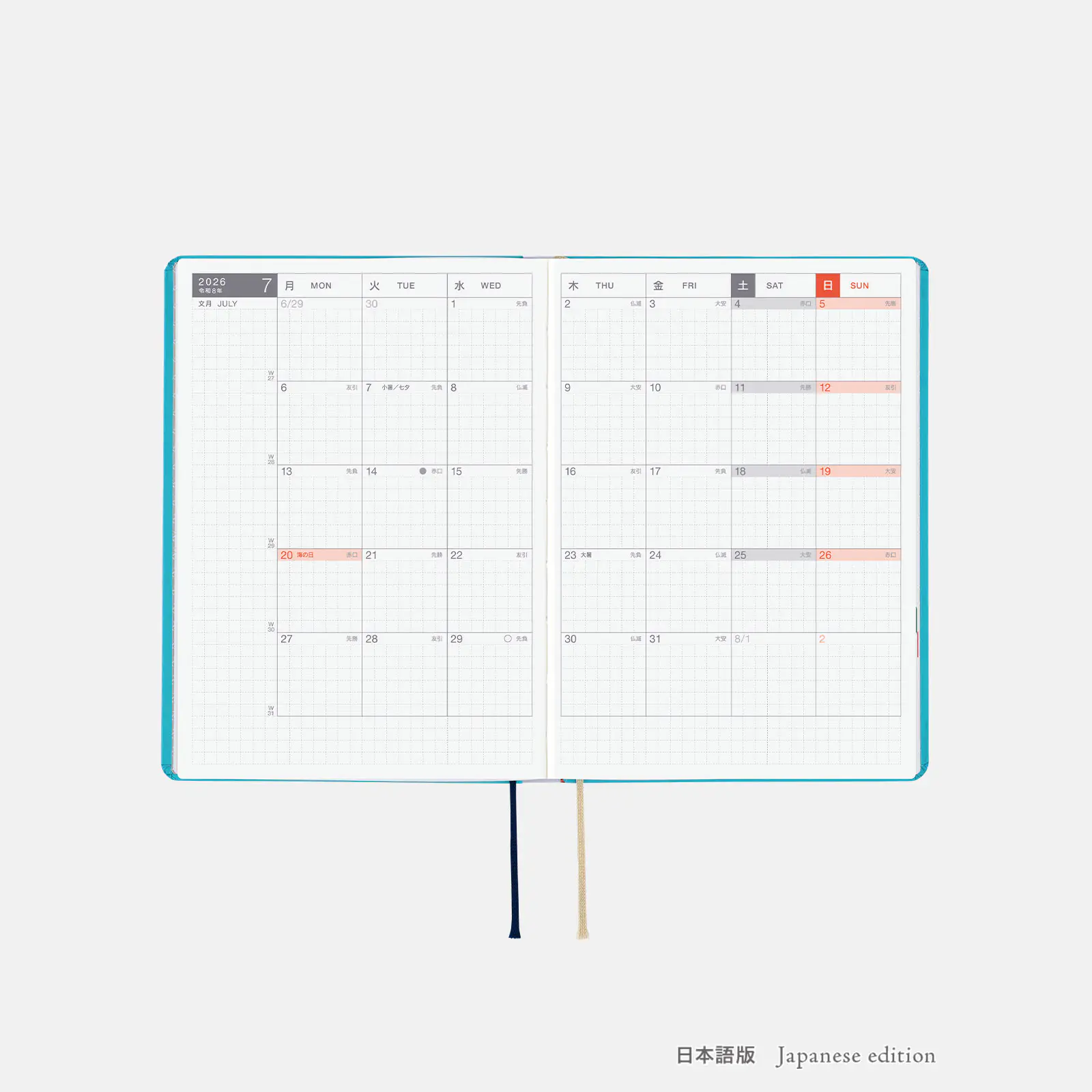 | 1日ページ | 2026年1月1日〜12月31日(全377ページ ) *各月のはじめに、「ことしの歳時記」と、その月のことをまとめて書ける扉ページ(1ページ)があります。 *すべてのページに「日々の言葉」を掲載。 *右ページに「ミニカレンダー」を掲載(月曜もしくは日曜はじまり)。 *このほか、1日ページのはじめに、自由に使える「Turning the page to a new year」(2ページ)があります。 |