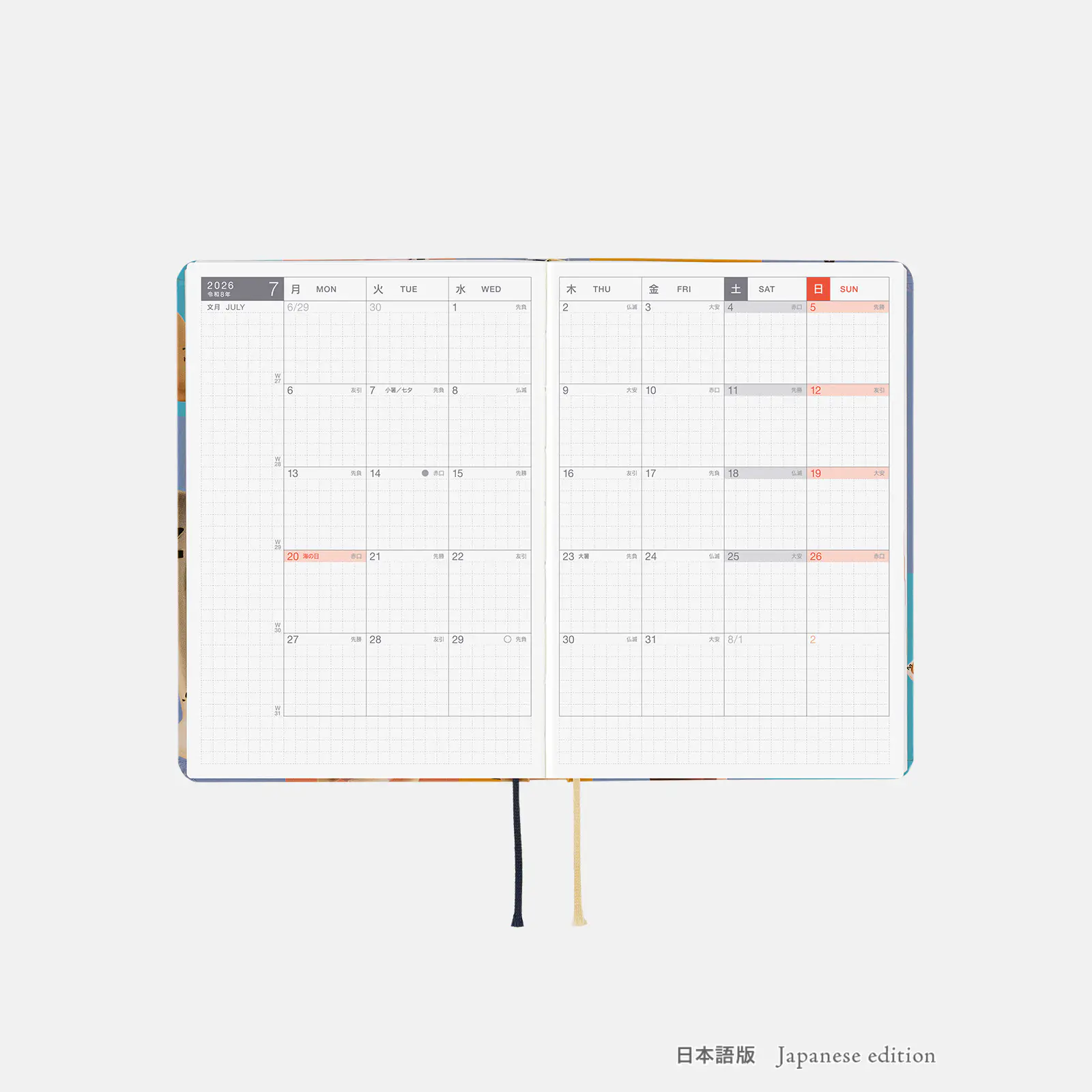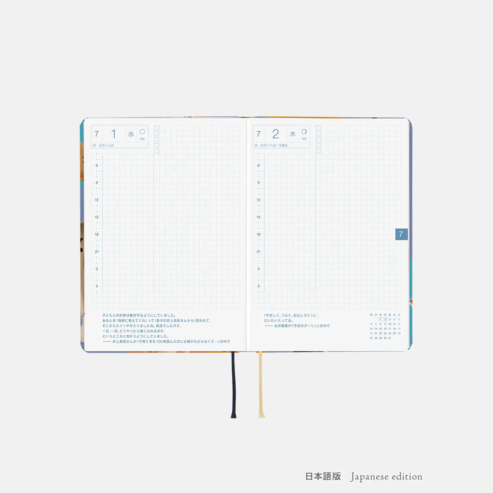 | 記載される内容 | 日番号/週番号(月間カレンダーに記載)/月の満ち欠け(1日ページ全ページに記載、月間カレンダーに満月と新月のみ記載) |