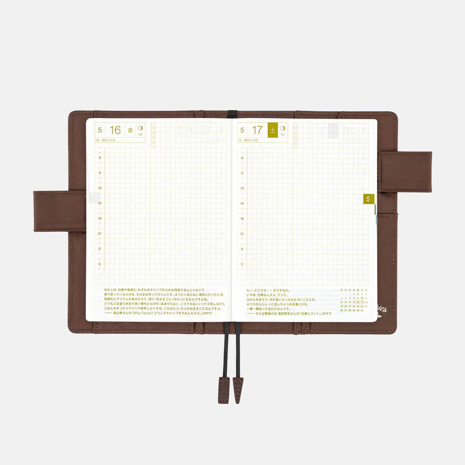 | 記載される内容 | 日番号/週番号(月間カレンダーに記載)/月の満ち欠け(1日ページ全ページに記載、月間カレンダーに満月と新月のみ記載) |