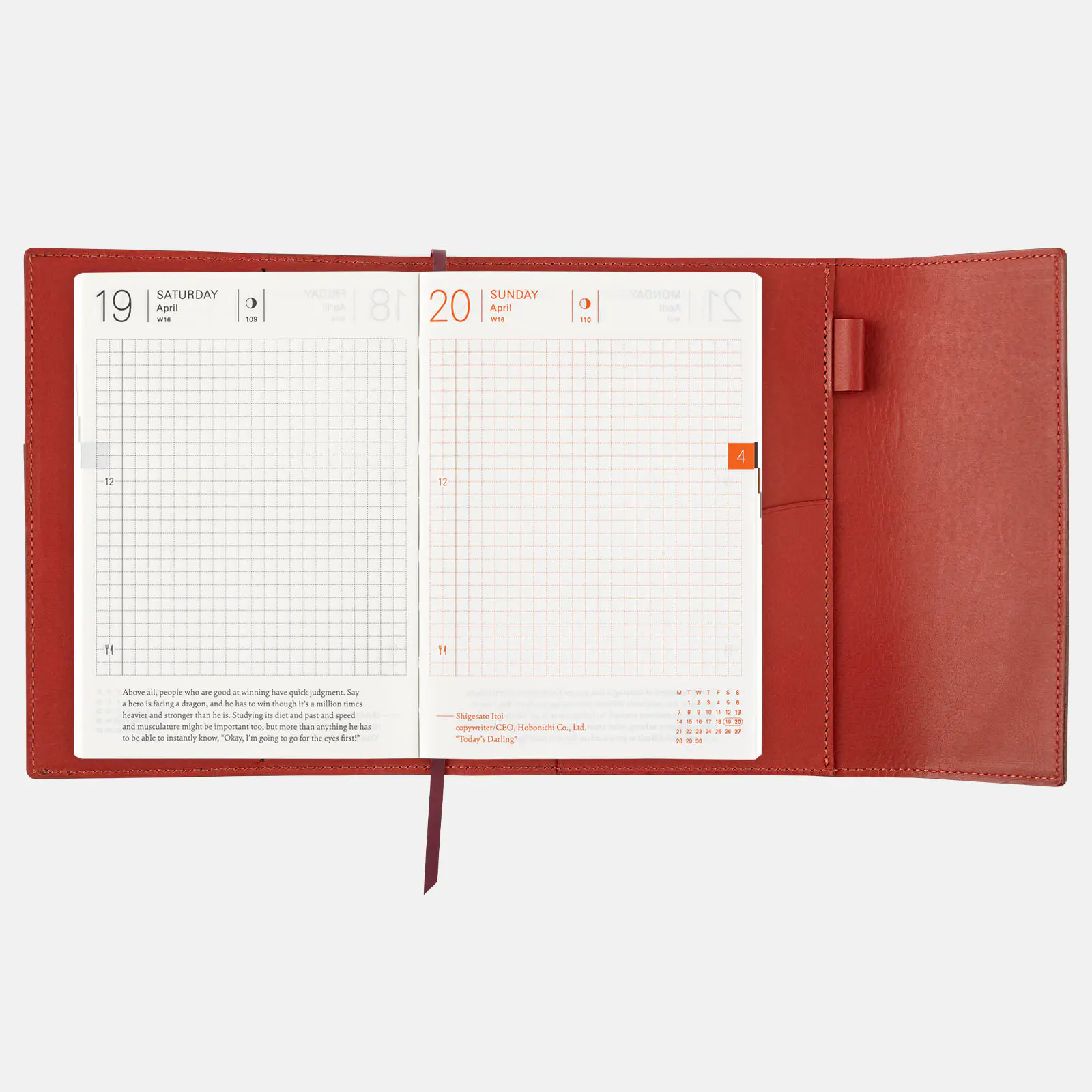 | 1日ページ | 前期 : 2026年1月1日〜6月30日(全187ページ) 後期 : 2026年7月1日〜12月31日(全190ページ) *各月のはじめに、「ことしの歳時記」と、その月のことをまとめて書ける扉ページ(1ページ)があります。 *すべてのページに「日々の言葉」を掲載。 *右ページに「ミニカレンダー」を掲載(月曜はじまり)。 *このほか、1日ページのはじめに、自由に使える「Turning the page to a new year」(前期:2ページ、後期:3ページ)があります。 |