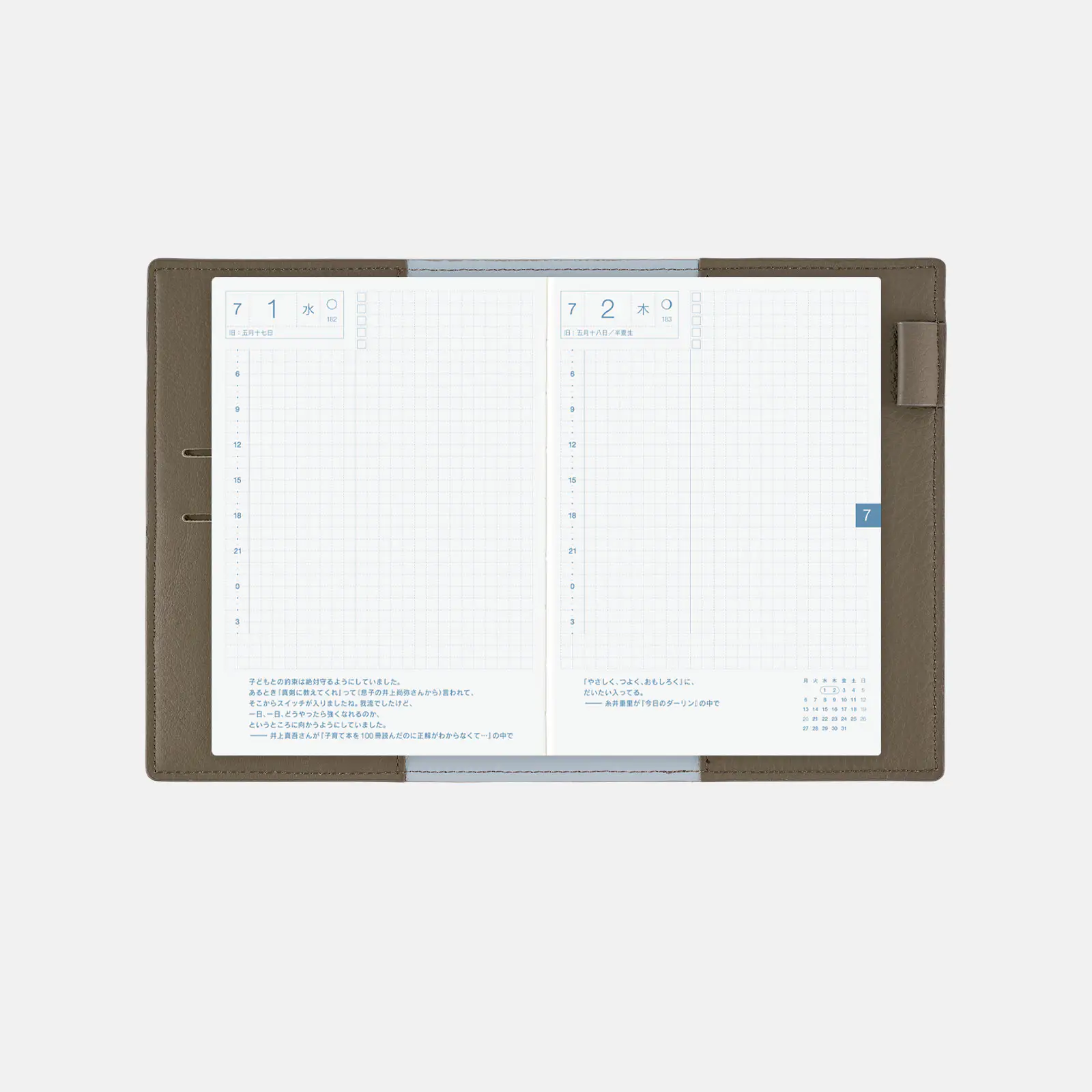 | 1日ページ | 前期 : 2026年1月1日〜6月30日(全187ページ) 後期 : 2026年7月1日〜12月31日(全190ページ) *各月のはじめに、「ことしの歳時記」と、その月のことをまとめて書ける扉ページ(1ページ)があります。 *すべてのページに「日々の言葉」を掲載。 *右ページに「ミニカレンダー」を掲載(月曜はじまり)。 *このほか、1日ページのはじめに、自由に使える「Turning the page to a new year」(前期:2ページ、後期:3ページ)があります。 |