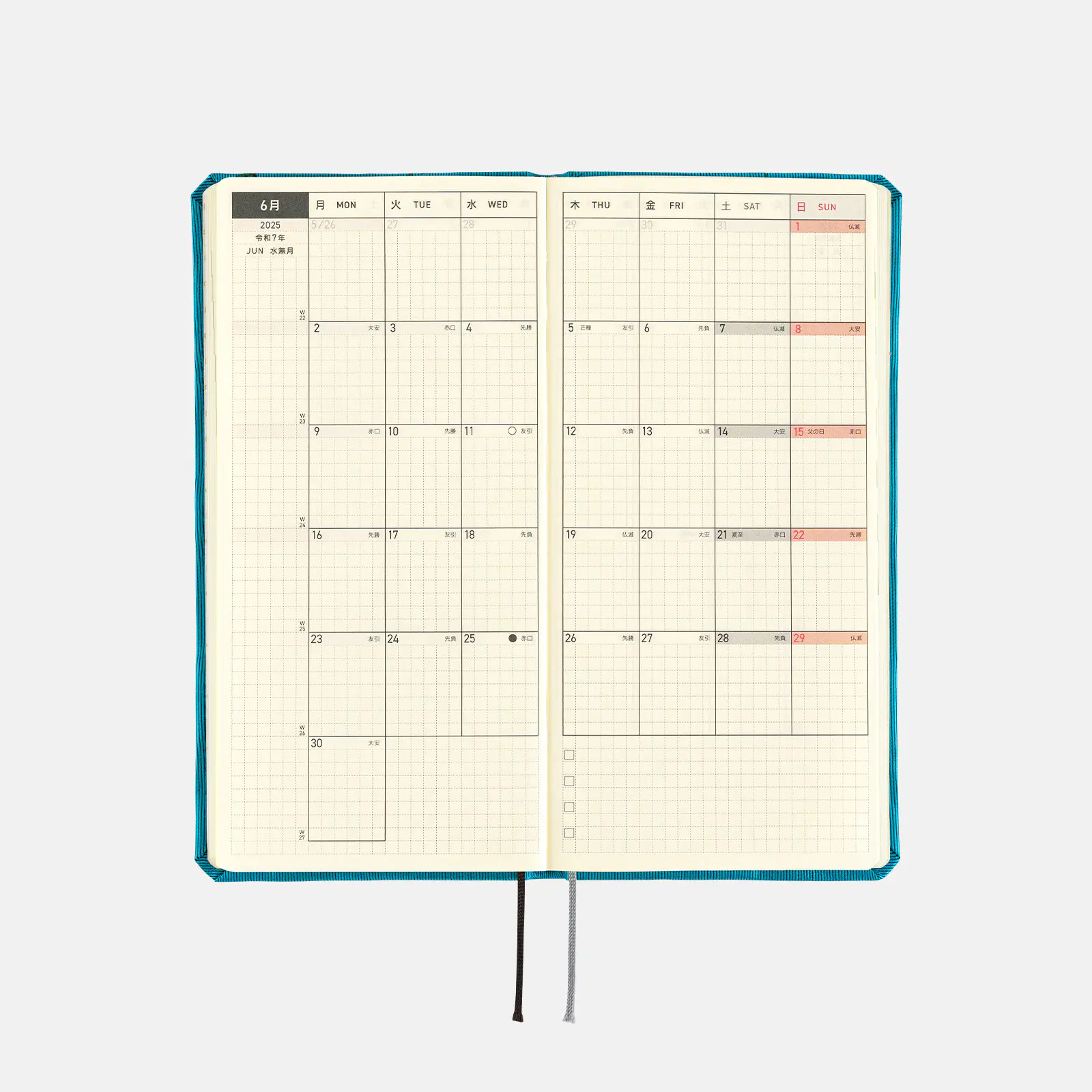 | 記載される内容 | 週番号/六曜(大安、仏滅など)/二十四節気(立春、春分、夏至など)/祝日、記念日など(バレンタインデー、ひなまつり、母の日、父の日など)/月の満ち欠け(週間ページ全てに記載・月間カレンダーに満月と新月のみ記載) |