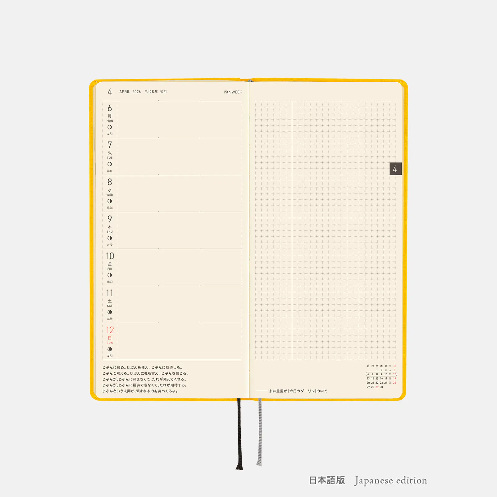 | 記載される内容 | 週番号/六曜(大安、仏滅など)/二十四節気(立春、春分、夏至など)/祝日、記念日など(聖バレンタインデー、ひな祭り、母の日、父の日など)/月の満ち欠け(週間ページ全てに記載・月間カレンダーに満月と新月のみ記載) |