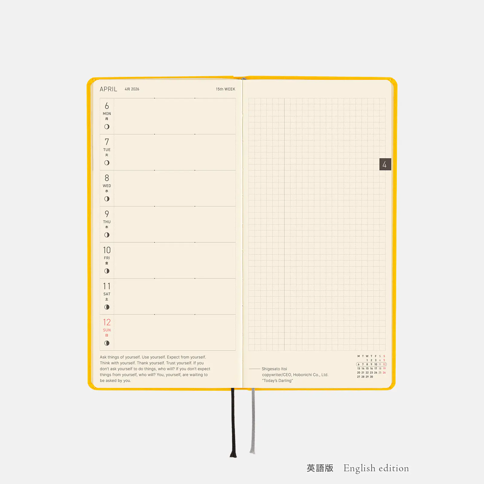 | 週間ダイアリー | 2025年12月1日〜2027年1月3日(全114ページ) *すべてのページに「日々の言葉」を掲載(見開きに1つ)。 |