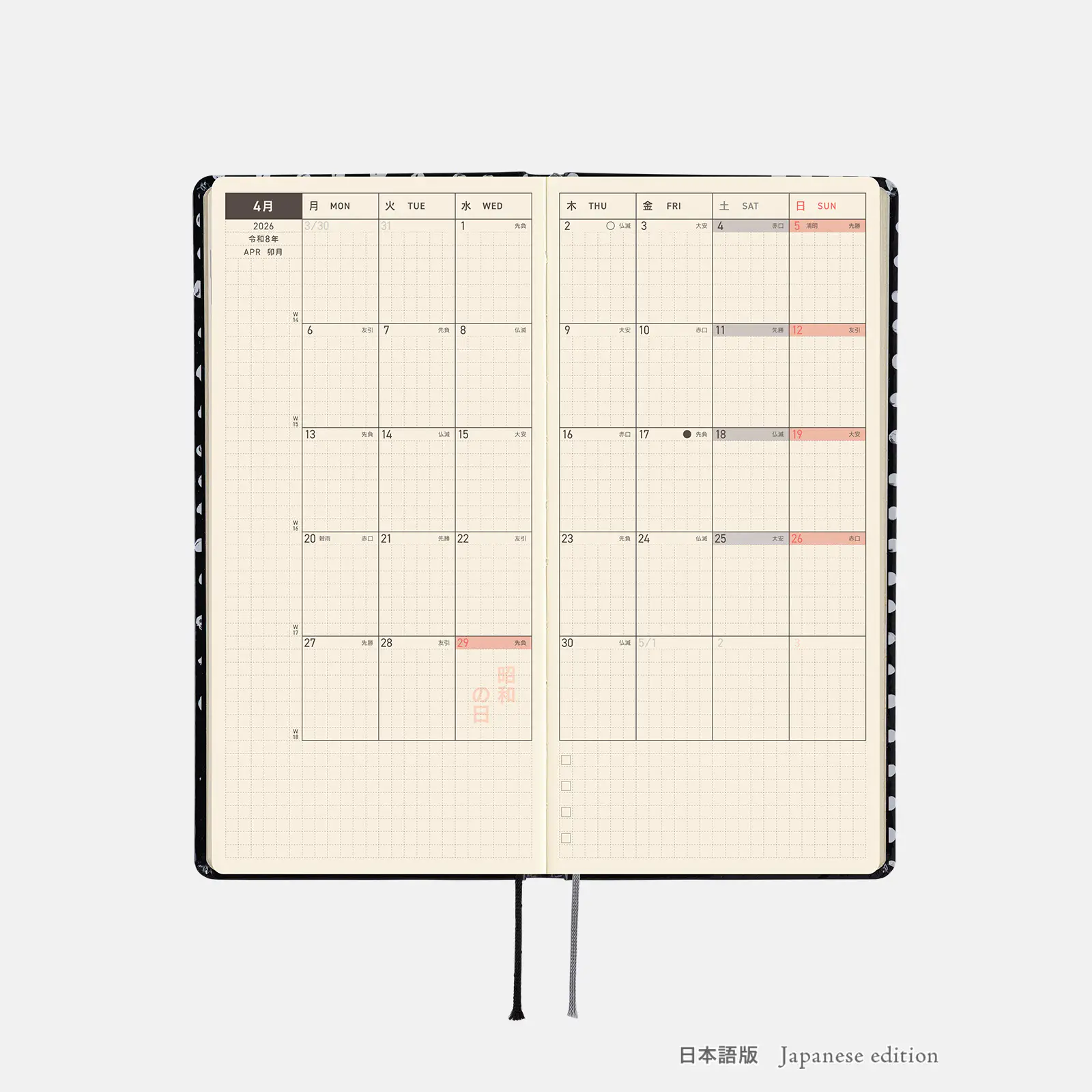 | 記載される内容 | 週番号/六曜(大安、仏滅など)/二十四節気(立春、春分、夏至など)/祝日、記念日など(聖バレンタインデー、ひな祭り、母の日、父の日など)/月の満ち欠け(週間ページ全てに記載・月間カレンダーに満月と新月のみ記載) |