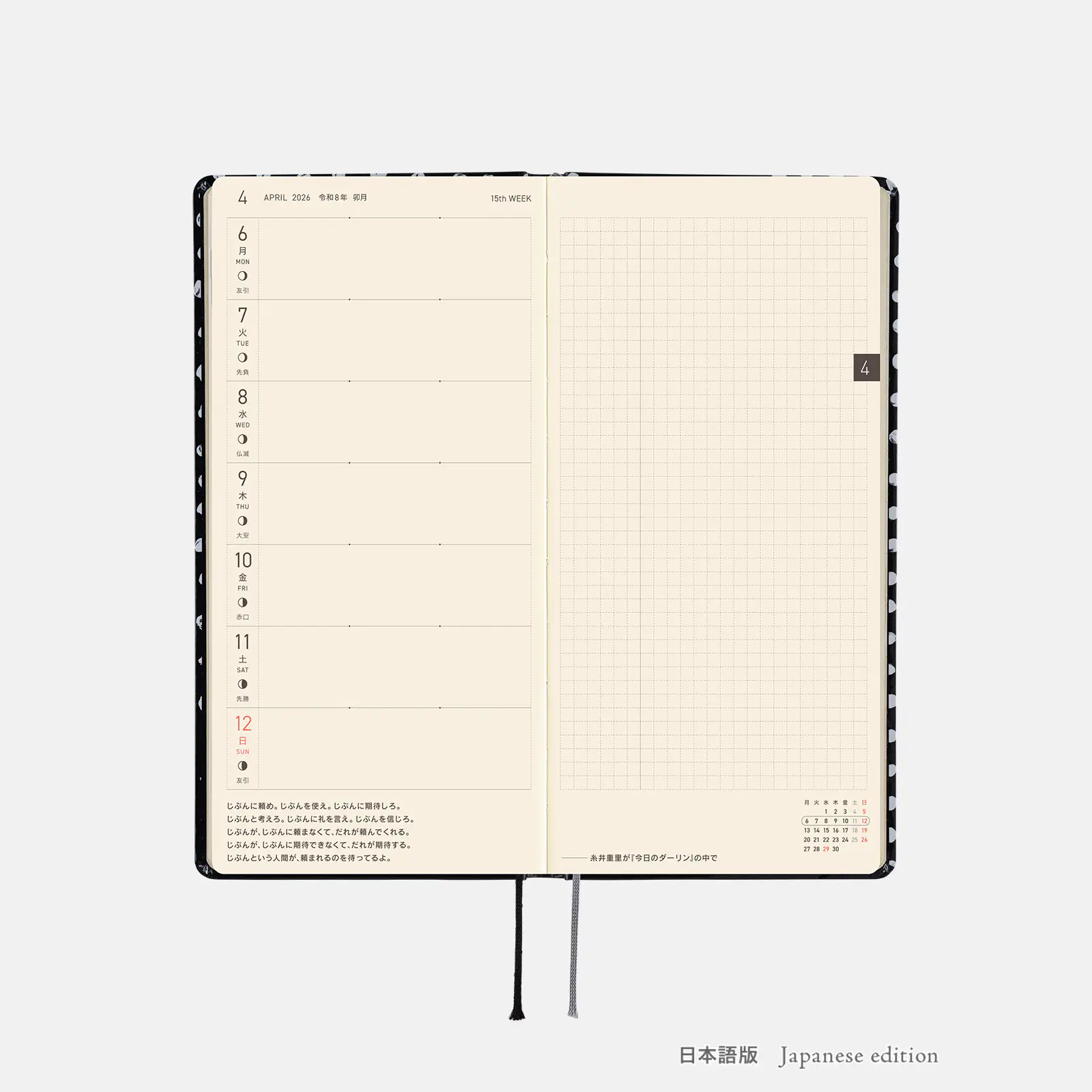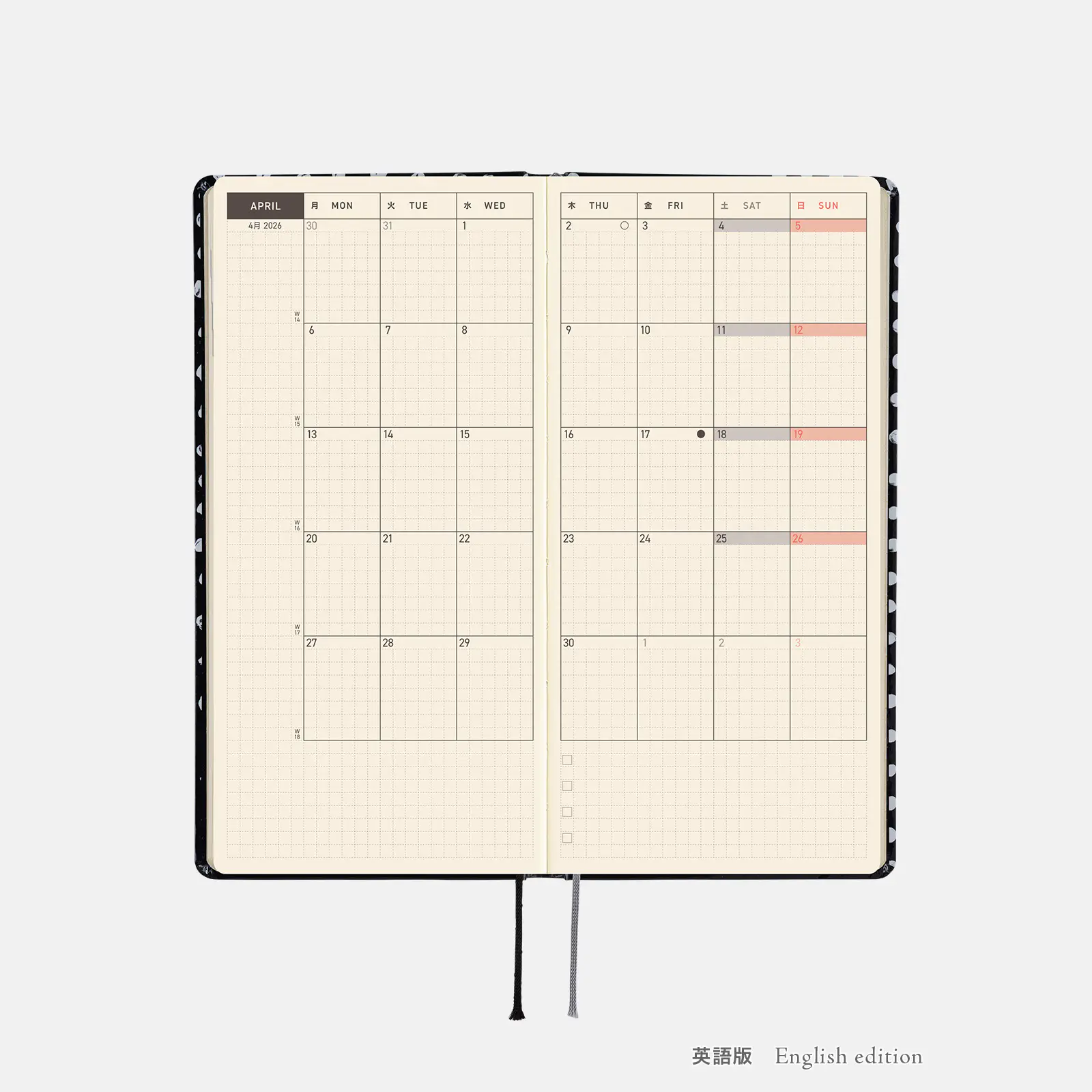 | 記載される内容 | 週番号/月の満ち欠け(週間ページ全てに記載・月間カレンダーに満月と新月のみ記載) ※祝日の記載はありません。 |