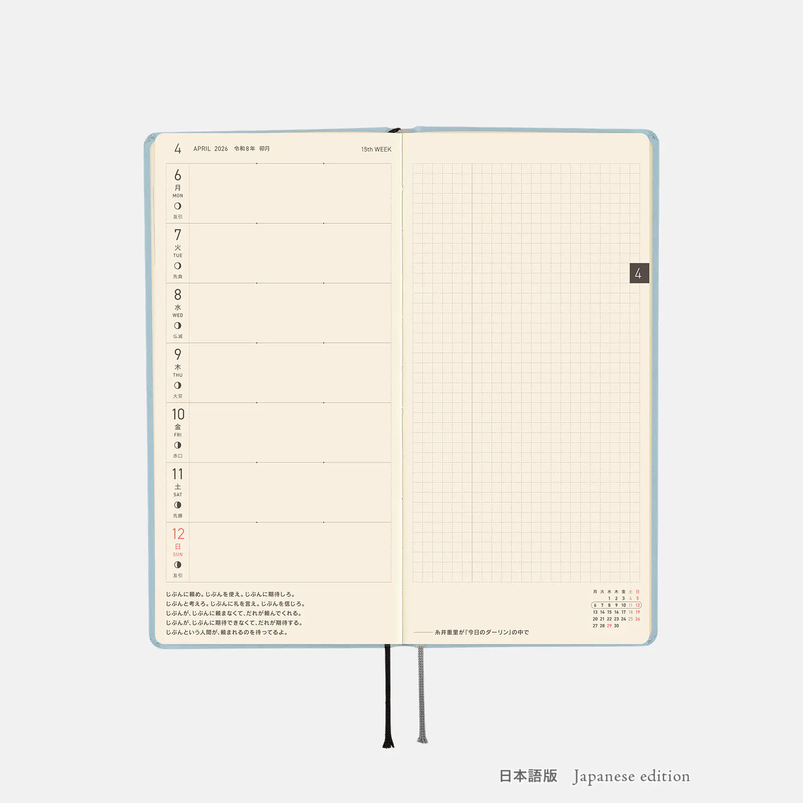 | 記載される内容 | 週番号/月の満ち欠け(週間ページ全てに記載・月間カレンダーに満月と新月のみ記載) ※祝日の記載はありません。 |