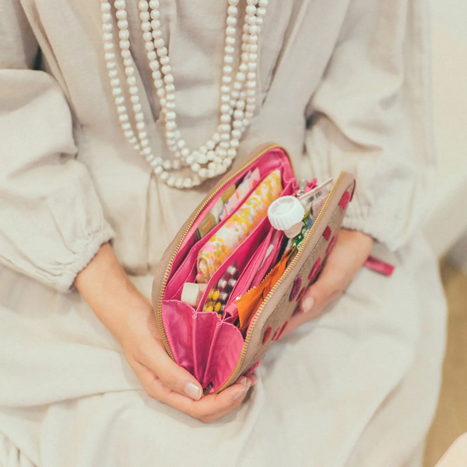 スマホやコスメ、メモなどを入れて、