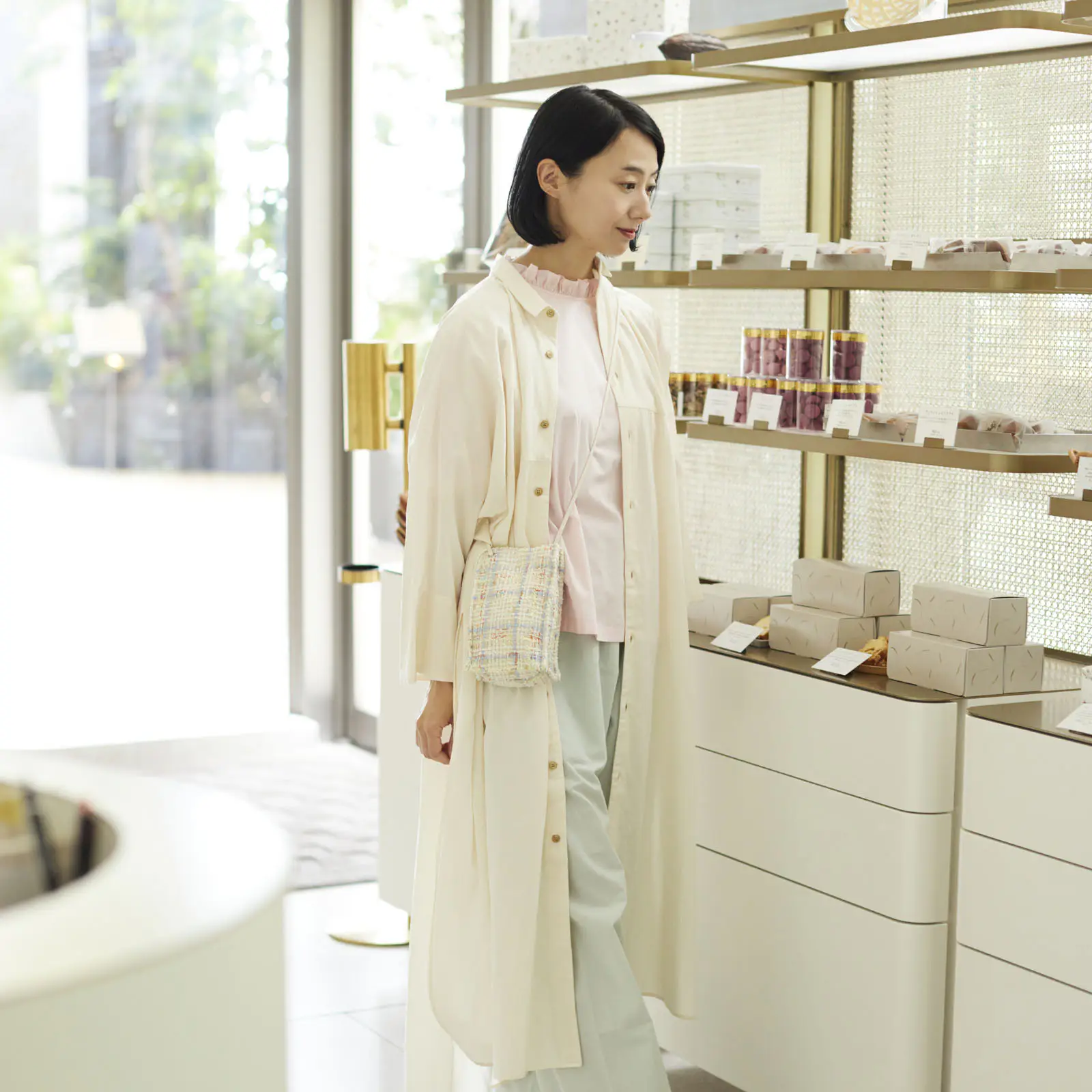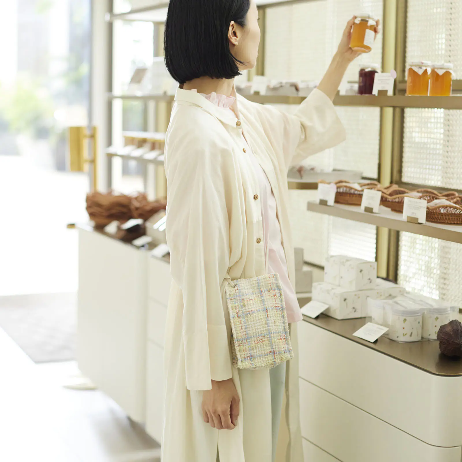 ちょっと近所へ出かけるときのミニショルダーとして。買い物などで帰りに荷物が増えそうなら、小さくたたんだエコバッグを入れておくと◎。