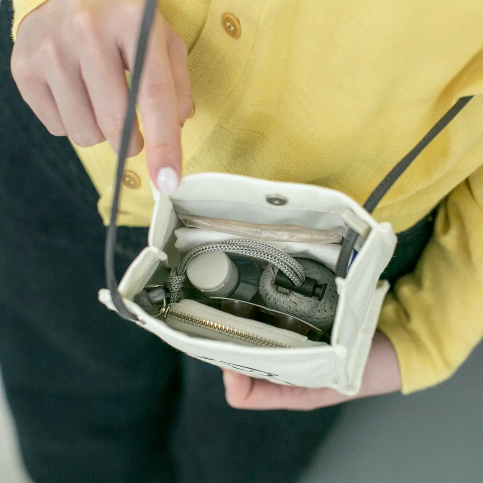 ショッピングに行くときのハンドバッグ代わりとしても重宝。スマホ、財布、ハンカチやハンドクリームなど、持ち物がコンパクトにまとまります。