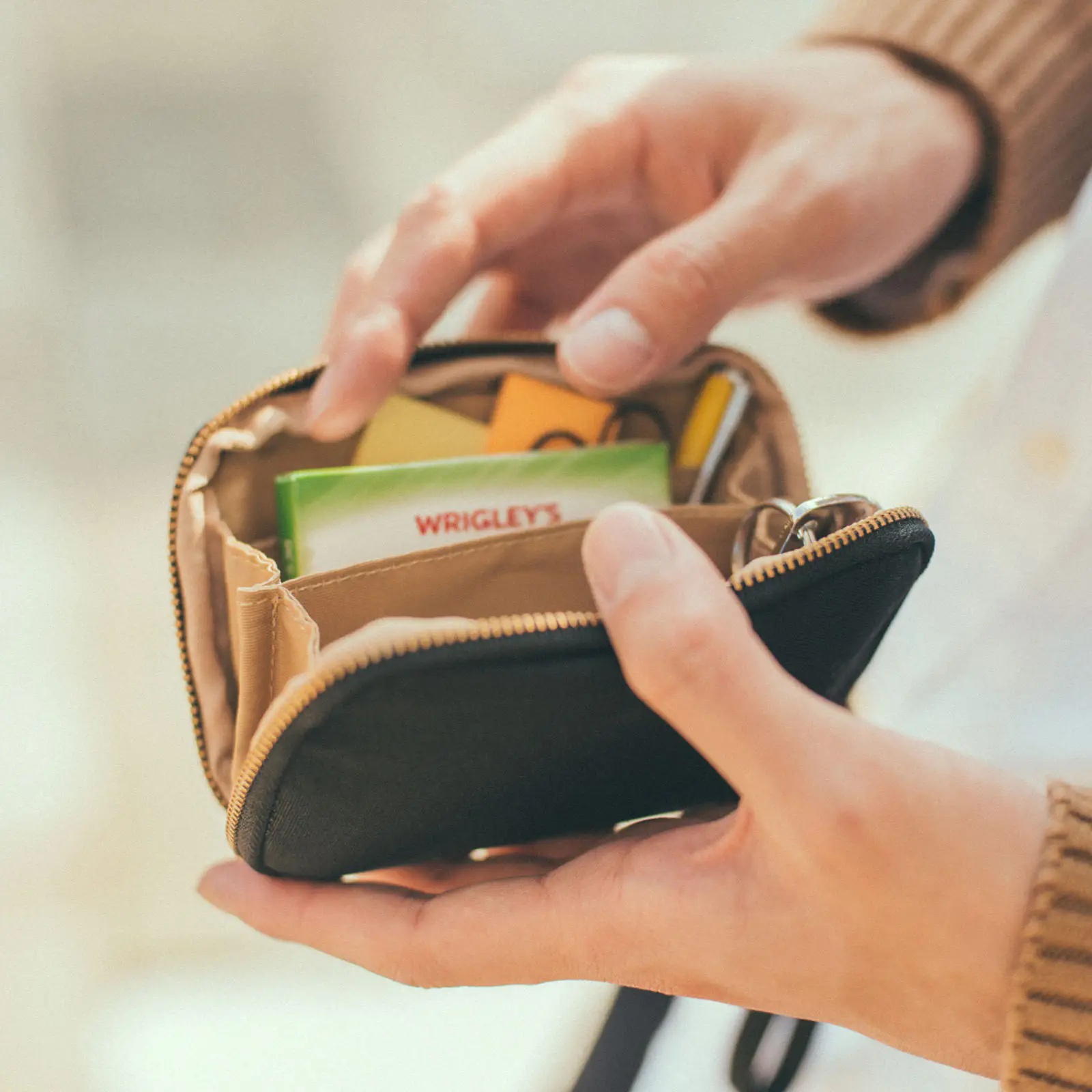 カードにお金、カギや薬類といった、必要最低限のものだけを持ち歩くポーチとして。出張中のホテル内でも、このポーチひとつがあれば安心です。