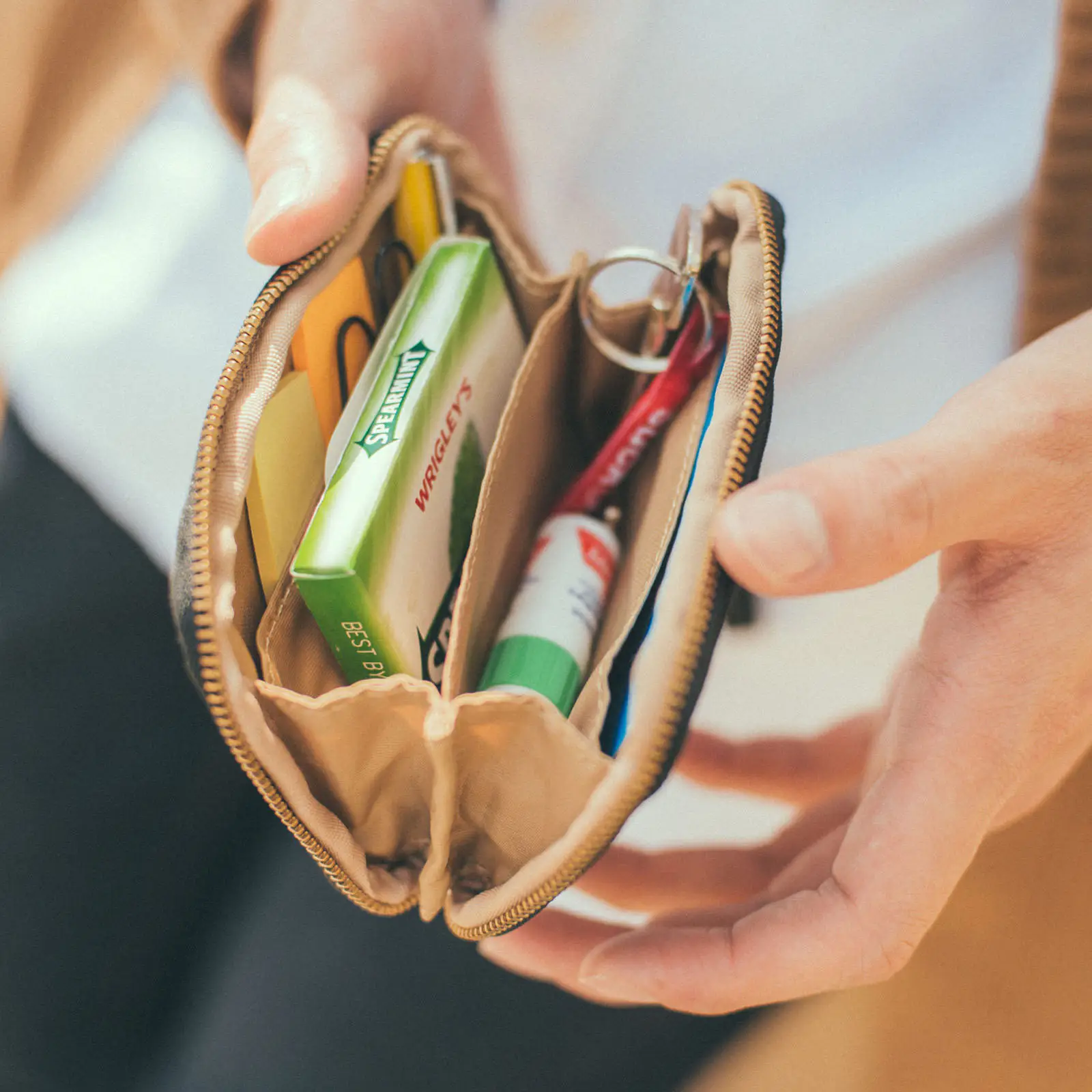 リップにミラー、短いペンやお金といった身の回りのものといっしょに、お気に入りのかわいい雑貨もひとまとめに。開けるたびにときめく、自分だけのポーチに。