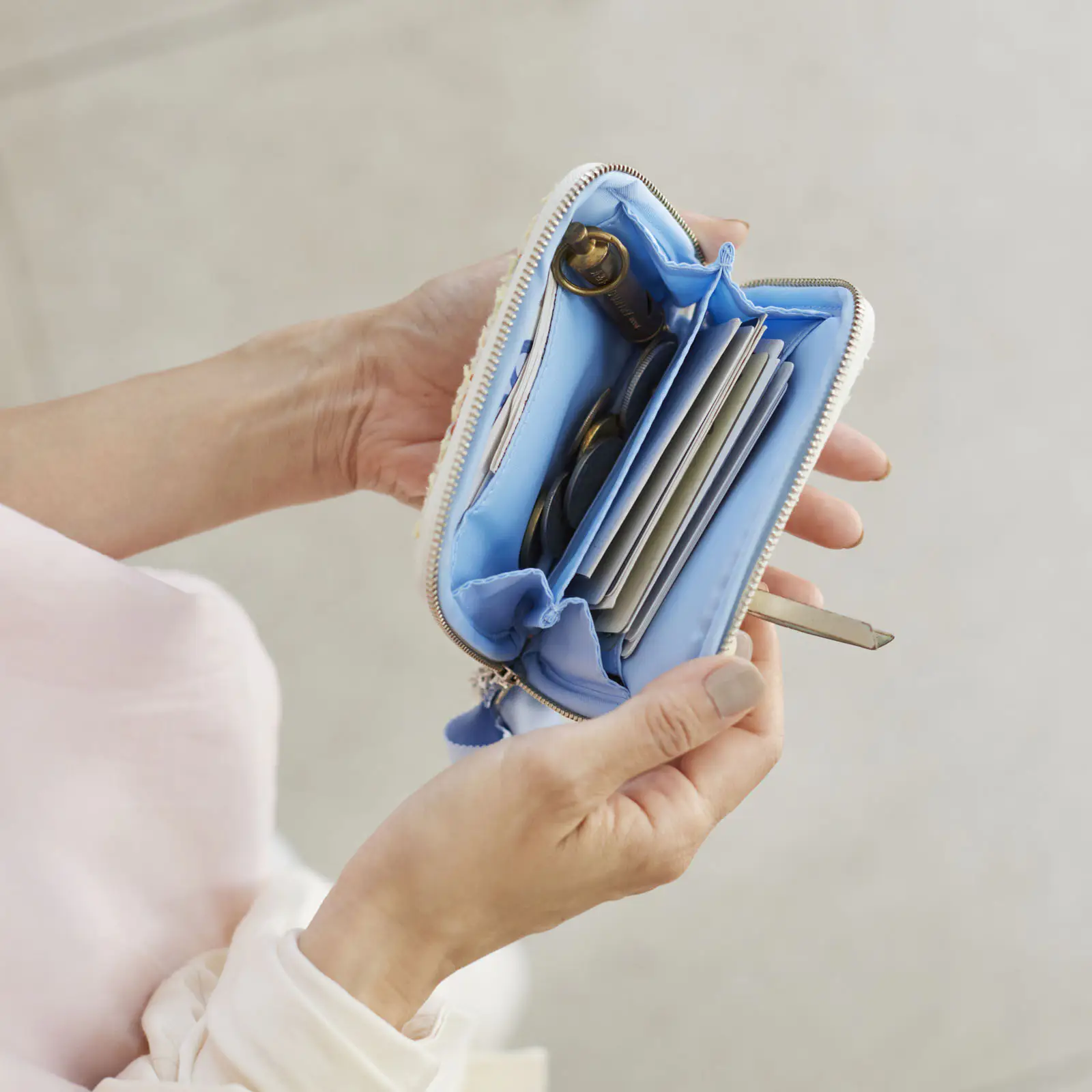 カードやお札、小銭をきっちり分けて入れておけるお財布として、お買い物のときに活躍します。おうちのカギやリップも、いっしょに持ち歩けます。