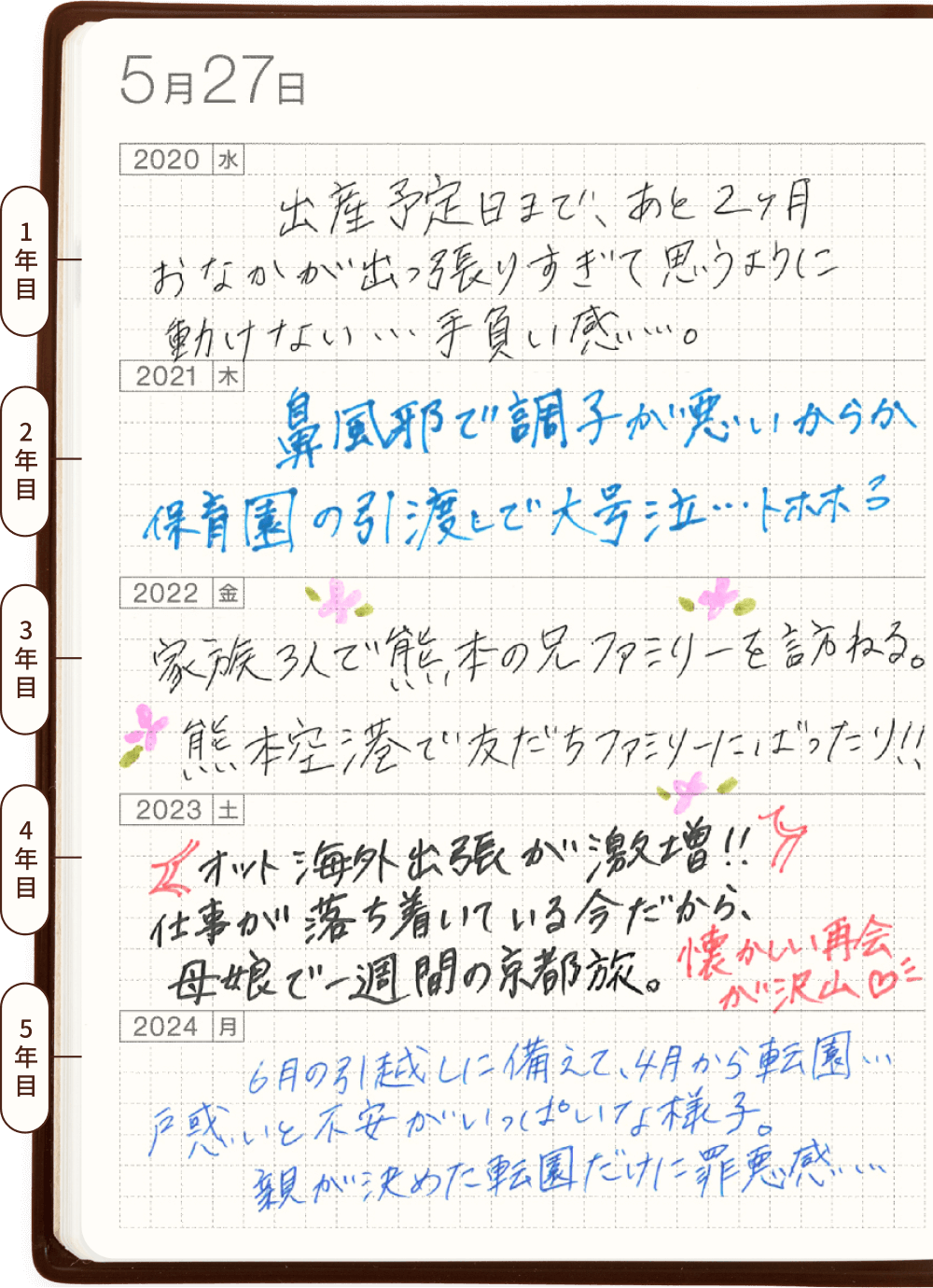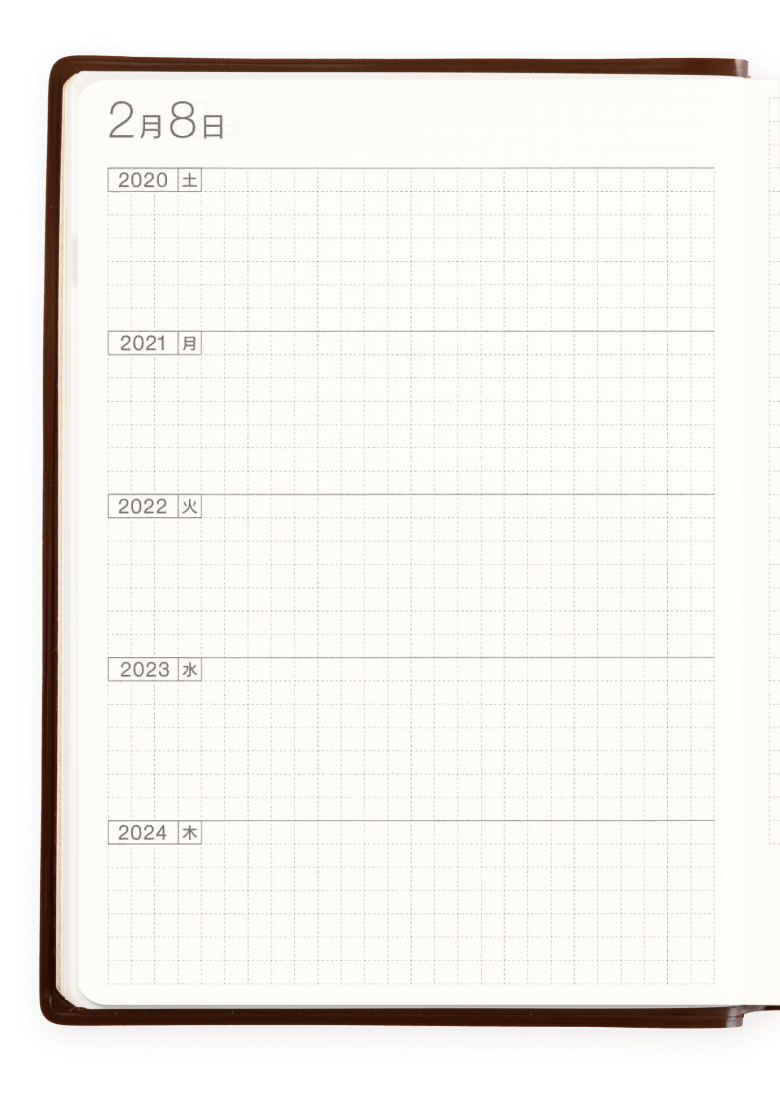 社会に出てからの5年間でどんな成長や変化があるかを残せます。「気温、天気、1行程度のメモ」とシンプルにかくだけでも、5年分が積み重なると貴重な記録に。「メモは1行でOK」と決めておくことで無理なく続けられます。