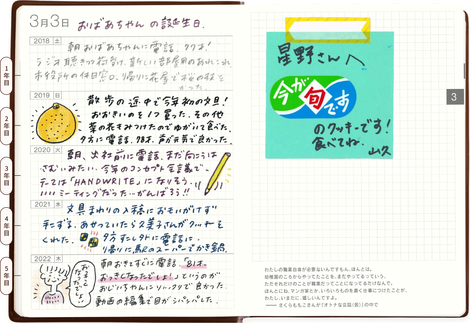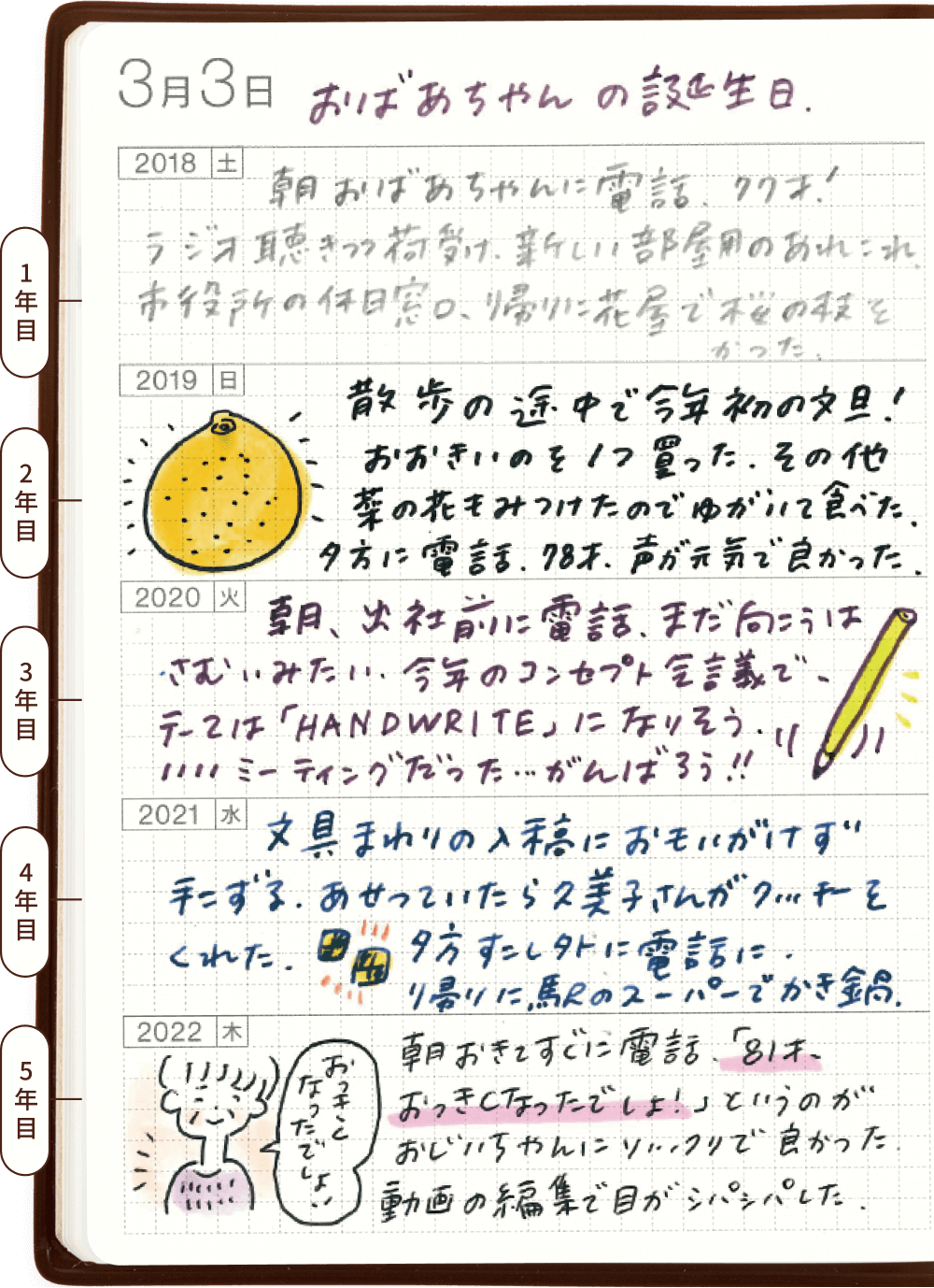誕生日を迎えたおばあちゃんの年齢や電話で話したことなどが、同じページに積み重なっていきます。その日の仕事や買い物のことなども短くメモしておくことで、あとから思い出したときのうれしさがさらに増します。