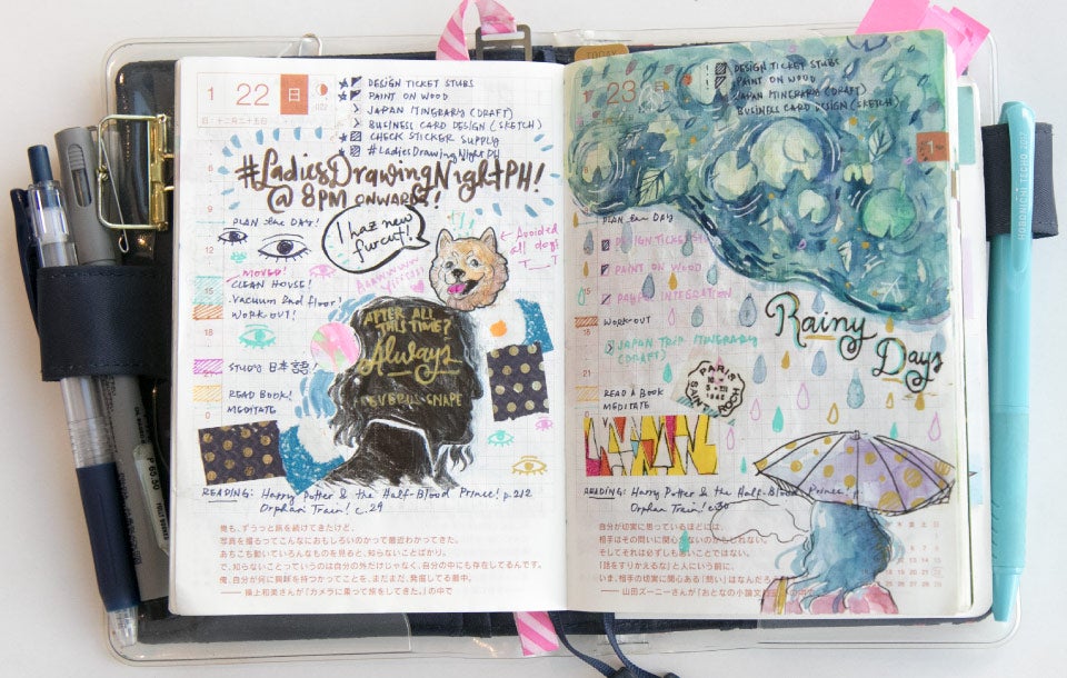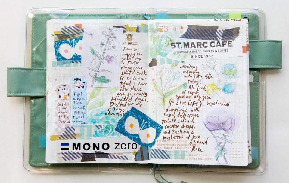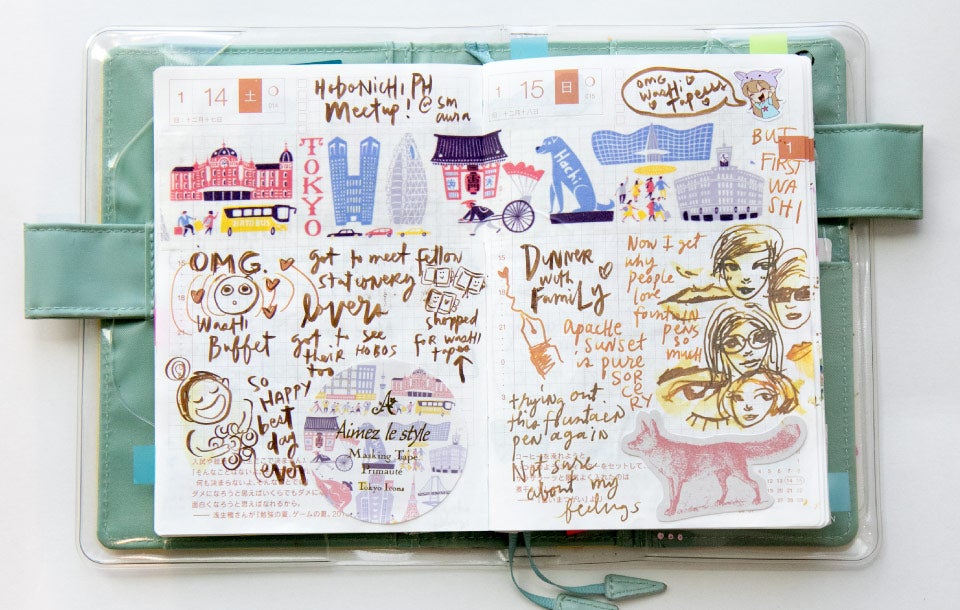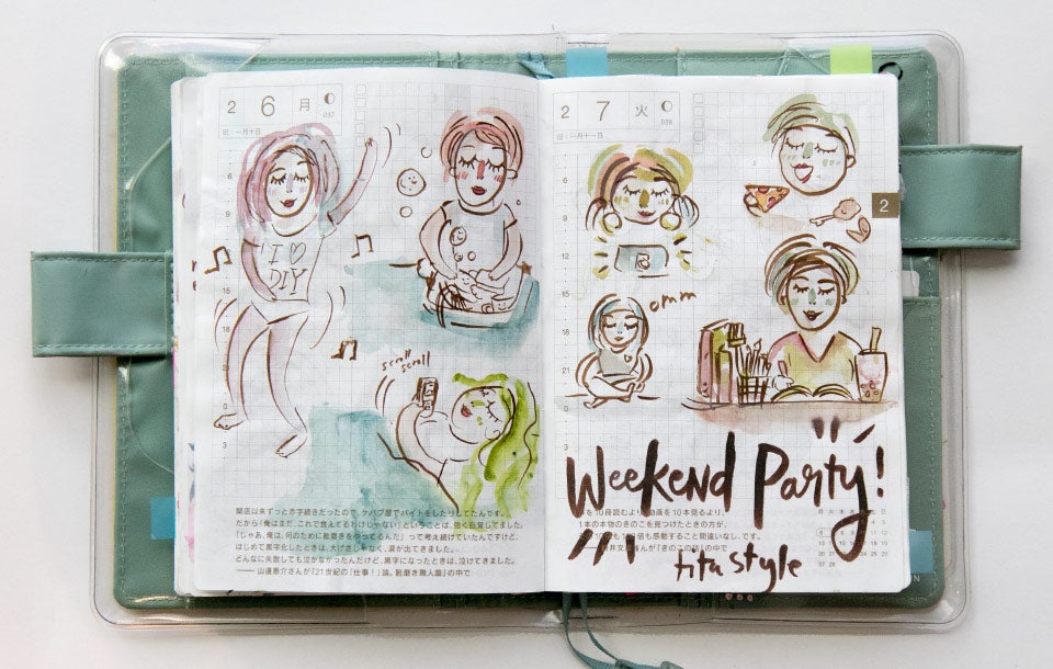 初めて実物を見たのは、2年前に日本のロフトに行ったとき。紙がすごく薄かったから、水彩絵の具で描いて大丈夫なのかが不安で、そのときは買わなかったんです。使い始めたのは今年からで、家に置く「HOMEbonichi」と、いろんなところに連れていく「ROAMbonichi」の2冊使いです。ほぼ日手帳の好きなところは、紙、カラフルなカバー、そしてコミュニティ。使いはじめてから、新しい仲間がたくさんできたんですよ。
