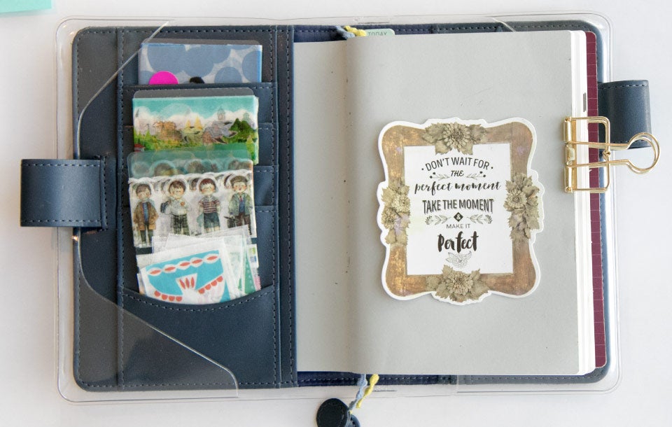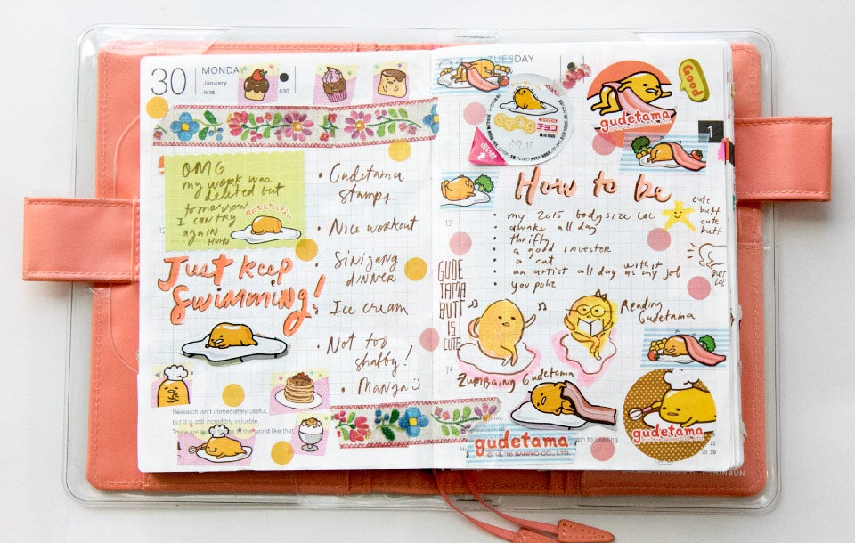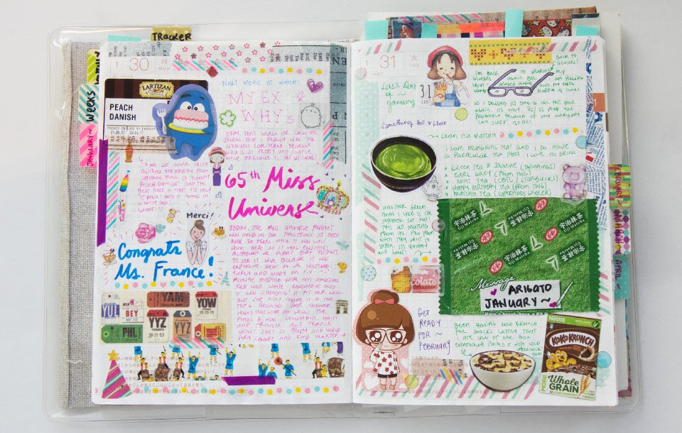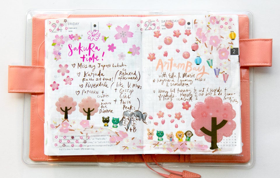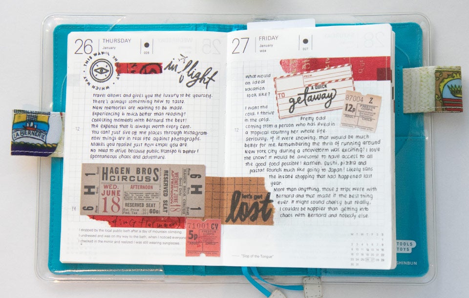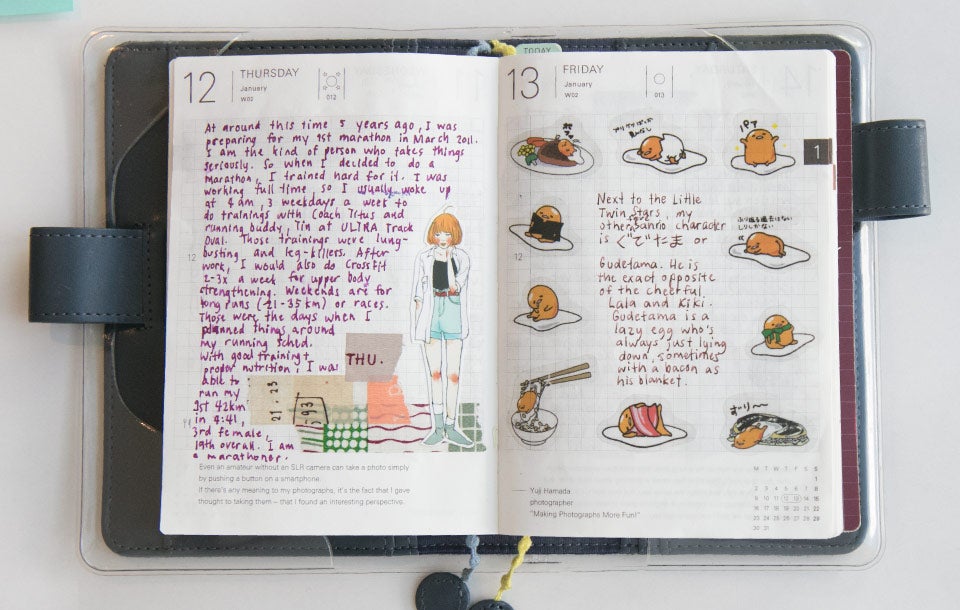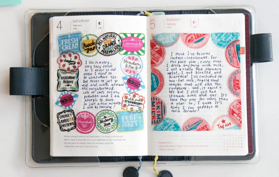 私はオリジナル(日本語版)とweeksの2冊使い。オリジナルの方はジッパーズの中にカバー・オン・カバー付きのバタフライストッパーカバーを入れています。オリジナルには、その日のできごとを短くリストアップしたり、その日あったいいことを書いたり。あとは好きなイラストをラミネート加工して貼ったり、お菓子のパッケージなどを切ってコラージュしていますね。weeksには仕事やイベントの予定を書いています。