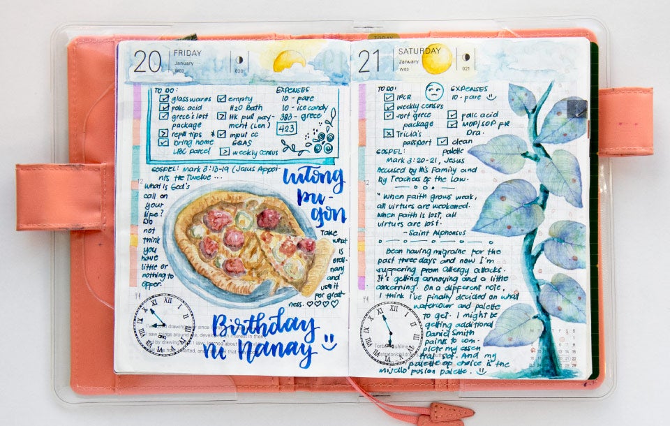 今年の1月から使っています。英語の言葉を読むのが好きなので、英語版にしました。いろんな手帳やスケジュール帳があるけど、ほぼ日手帳がいちばん好き! だいたい、夜にその日の予定や印象深かったできごとを書いています。あるとき、トモエリバーの紙に水彩絵の具でもきれいに描けることを発見。それからは果物とか野菜とか、好きなものをランダムに描いています。月間スケジュールのページにも、水彩絵の具を使っています。