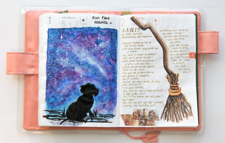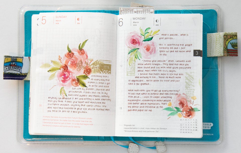 2015年の後半から使っています。インスタグラムで見つけて、方眼のページやデザインにひとめぼれしたんです。買ったのは、「Scribe Writing Essentials」という文具店。どこへ行くにもいっしょで、仕事中のちょっとした隙間時間など、いつでも書きたいときに書いています。手帳を書いているとイライラしたことがあっても気分転換できるし、幸せでリラックスした気持ちになれるんですよね。