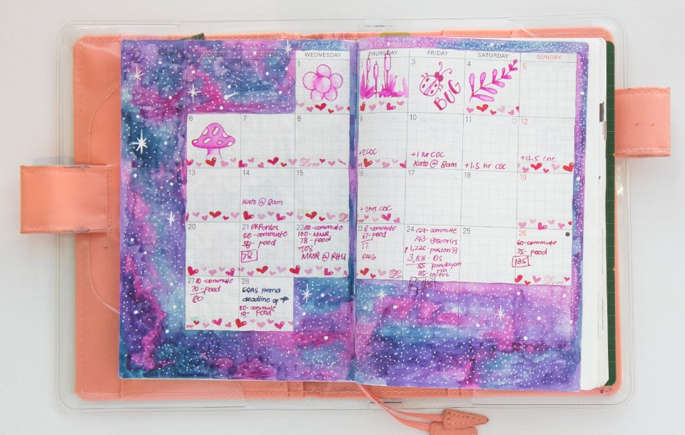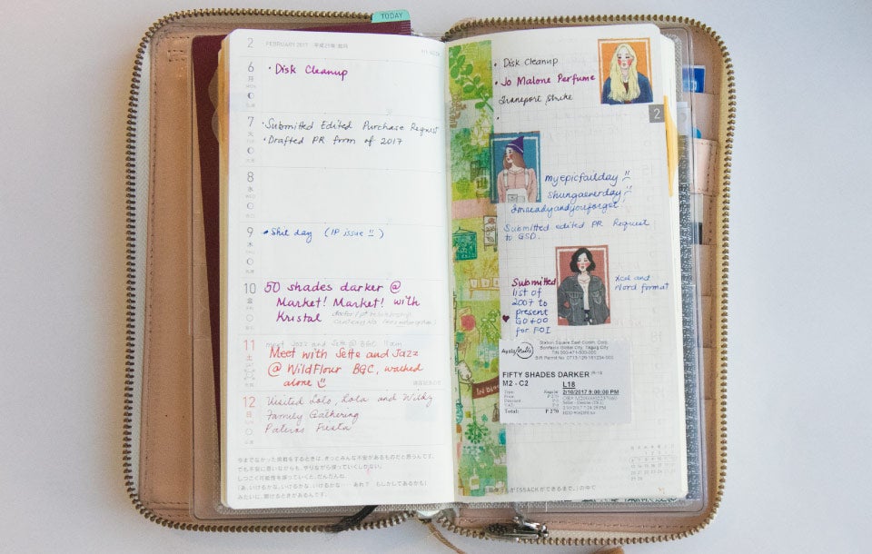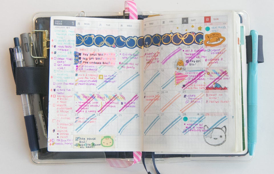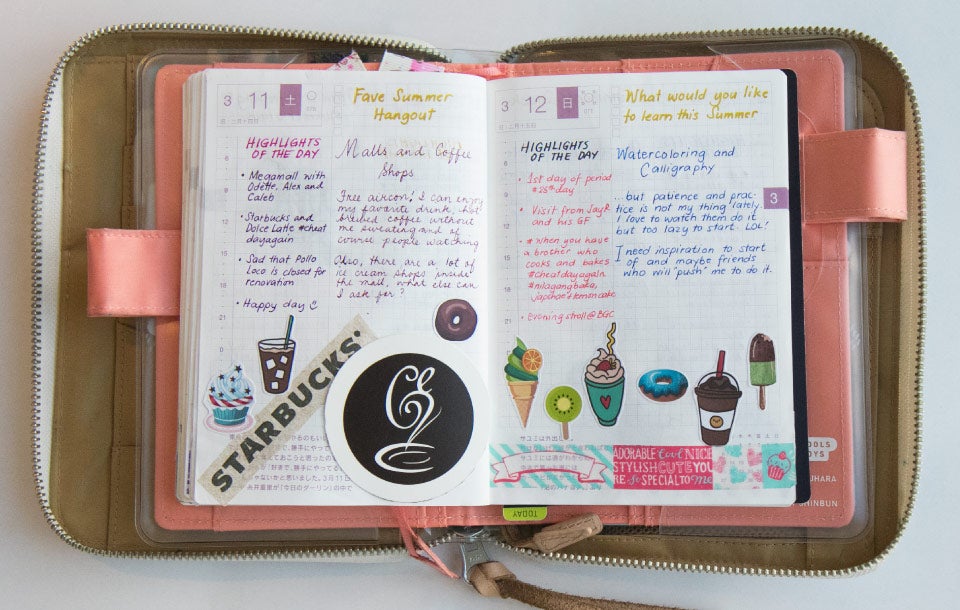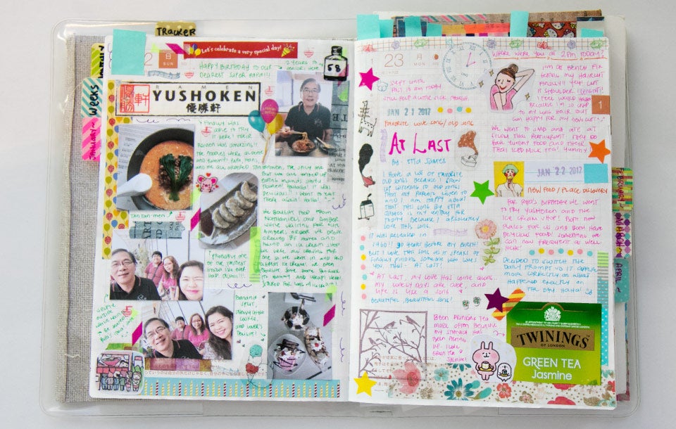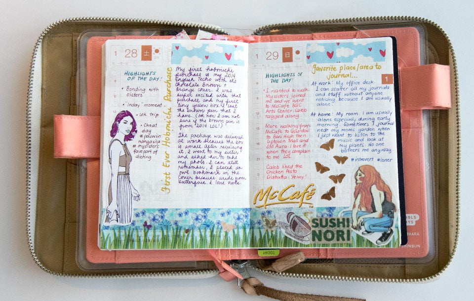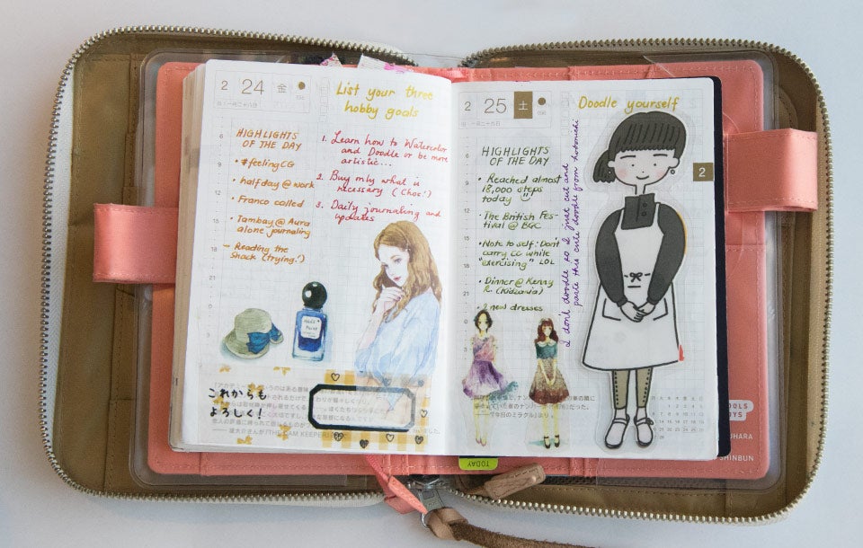 使い初めて1年半です。月間ページには、その日笑顔になれたことを一日ひとつ書いています。それは、子どもが言ったひとことや、日本からほぼ日スタッフがマニラに来ることだったり、使っていなかったバッグからお金が見つかったっていうことだったり。1日ページには、マスキングテープでデコレーションをして、毎晩寝る前に日記を書いています。私は絵が苦手なんだけど、こうすればたのしくまとめられるので、うれしいです!