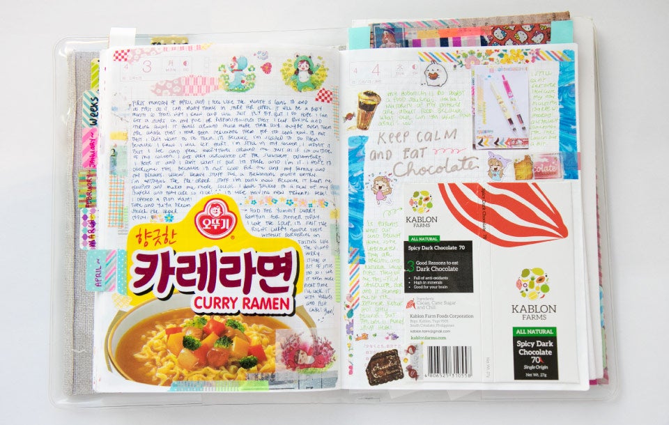 今年使い始めたばかりなので、このavecカズンが私の初めてのほぼ日手帳。本体は日本語版を使っています。方眼に合わせて文字を書いているんだけど、日本語版の方眼サイズのほうが私にはぴったりだから。そして中身は、ほぼ食べ物日記。食べたものやそのお店について書いています。ラーメンが大好きなので、食べたあとには袋を貼ることもありますよ。ふだんは家に置いて日記にしていて、Meetupのときだけ持ち出しています。