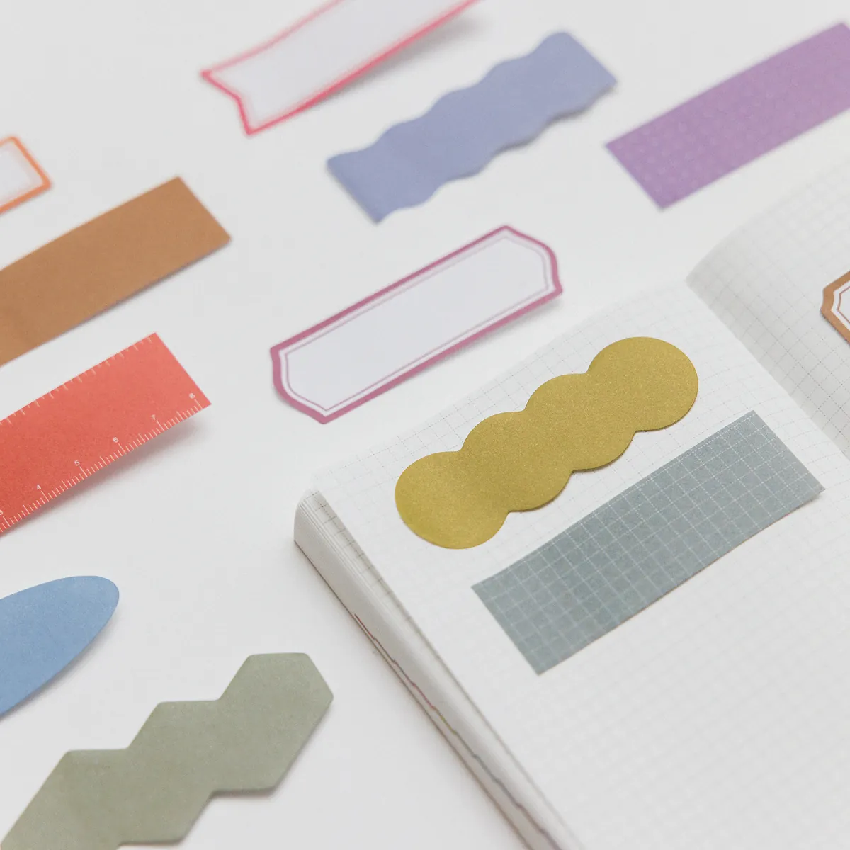 フレームやガイドがデザインされたものや、さまざまなかたちのダイカットタイプなど、使いやすいサイズのふせんです。