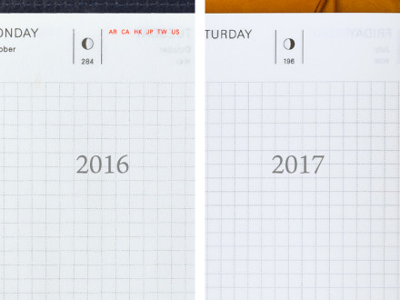 In response to requests for a place to transition to the new year’s planner, we’ve added a section entitled Turning the page to a new year. To make room for the new section, the two-day-per-page section has been removed.