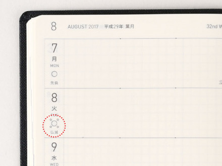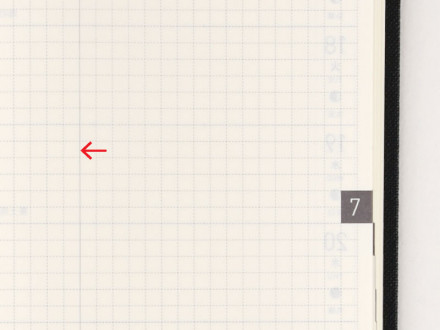 In order to facilitate the most efficient use of the limited space in each day, we've included two subtle dots to split each day into morning, afternoon, and evening. You can use these however you see fit, such as writing plans in the two left spaces and random notes in the one right space, or disregarding the dots altogether.