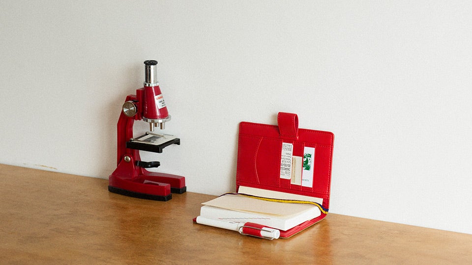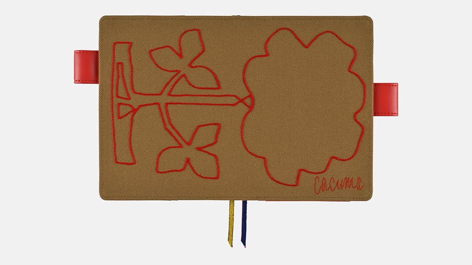 Cacuma is a fashion brand created in collaboration with art director/designer Yoshie Watanabe and Hobonichi. This Cacuma-brand cover features red embroidery on coarse canvas material. The pattern seems abstract at first glance, but open the cover and view it in full to see the image of a rose embroidered in a way that looks like a single-stroke drawing.