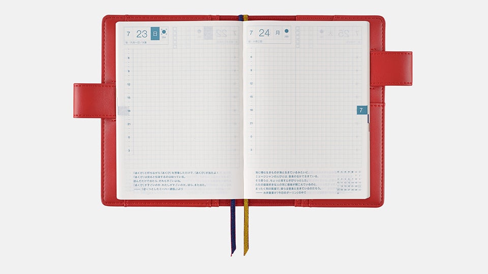 *A page is included at the beginning of each month to help in planning ahead.Quotes One per day (Japanese) Weekly Calendar Not included Memo Page 15 pages Informational Pages Time Table / Graph Paper / Favorites / My 100 / Favorite Local Japanese Sweets / Interacting with Cats and Dogs / Solar Terms / Emergency Preparedness / Useful First Aid Tips / Conversion Table / Age Table / Gifts / Addresses (for 6 People) / Useful Links / Personal Notes Listed information Day of the year / Week of the year (listed on monthly calendar) / Rokuyo (Traditional Japanese lunisolar calendar) (listed on monthly calendar) / Solar terms (Japanese) / Japanese holidays / Moon phase (daily pages include every phase, monthly calendars only include full and new moon) - Book Only (Hobonichi Techo Original / Japanese / April Start / Monday Start)