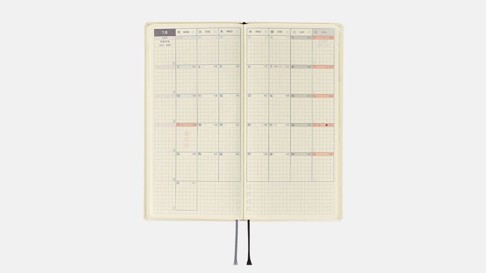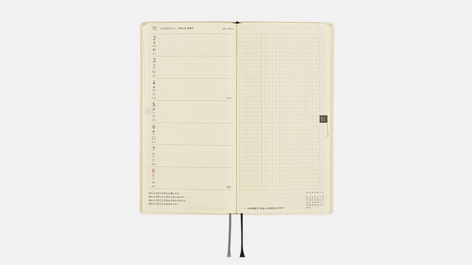 (Specifications may vary slightly)Weight Approx. 138g Main material Rayon Total pages 240 pages Binding Type Stitch-binding Paper Type Tomoe River paper (planner-specific type) Grid size 3.55 mm Yearly Calendar 2016 - 2018 Yearly Index Apr. 2017 - Mar. 2018 (2 pages) Monthly Calendar Mar. 2017 - Apr. 2018 (28 pages) Quotes One per week Weekly Calendar Feb. 27, 2017 - Apr. 1, 2018 (114 pages) Memo Page 76 pages Informational Pages Shorthand Note-Taking / Solar Terms / Favorite Local Japanese Sweets / Interacting with Cats and Dogs / Emergency Preparedness / Useful First Aid Tips / Age Table / Conversion Table / Useful Links / Contact Book / Personal Notes Listed information Week numbers / Rokuyo (Traditional Japanese calendar) / Solar terms (Japanese) / Japanese holidays / Moon phase (weekly pages include daily phase, monthly calendars only include full and new moon)