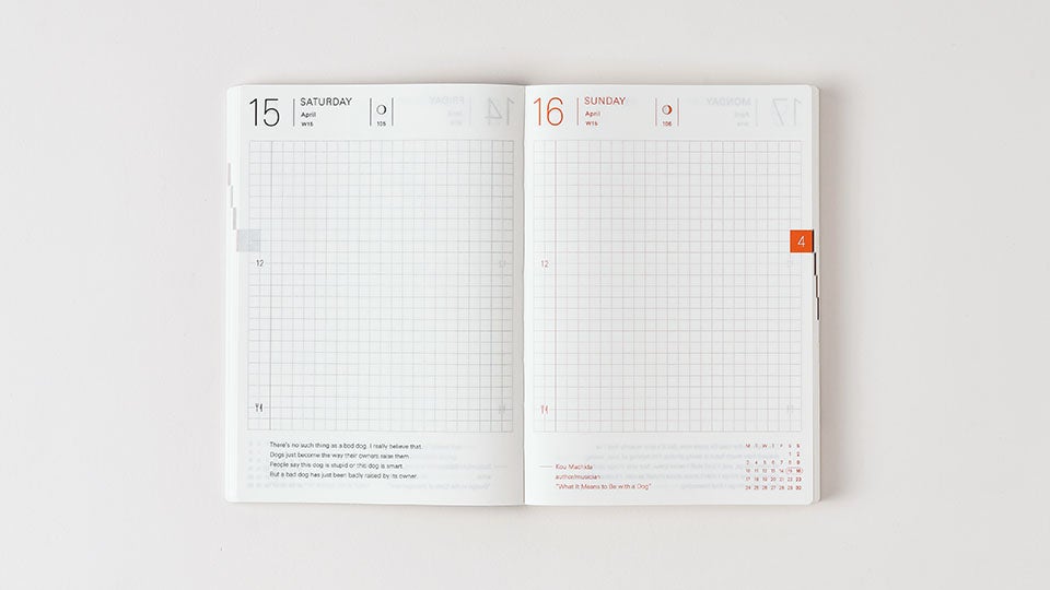 From the heartfelt to the humorous, the Hobonichi Techo includes quotes specially chosen from its parent site, the Japanese web magazine Hobo Nikkan Itoi Shimbun. Each two page spread contains a single quote.