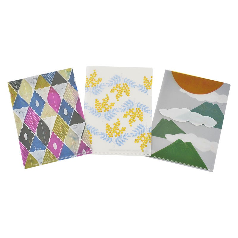 羽や花が舞うやさしいデザインです。
