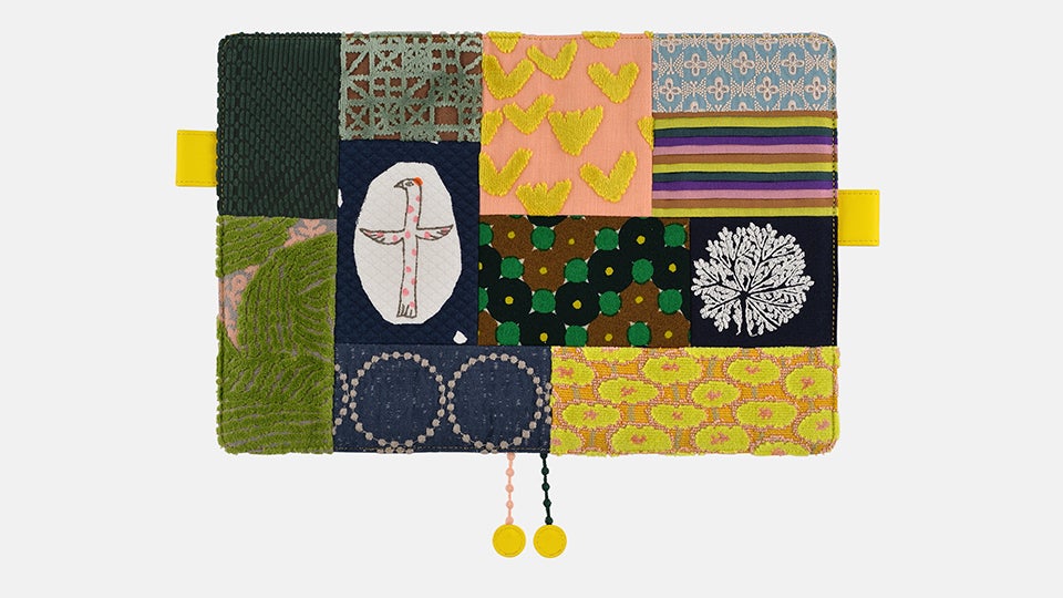 糸の先を紐の編み目にさし込んでお使いください。- パッチワークの生地の色や柄は