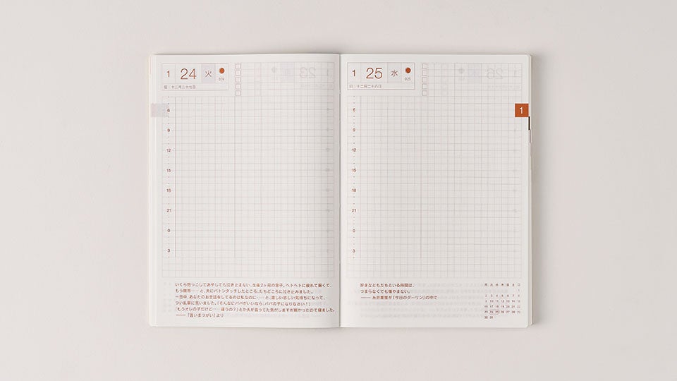 - 日番号/週番号(月間カレンダーに記載)/旧暦の表記/六曜(大安、仏滅など)(月間カレンダーに記載)/二十四節気(立春、春分、夏至など)、雑節/祝日、記念日など(バレンタインデー、ひなまつり、母の日、父の日など)/月の満ち欠け(1日ページ全ページに記載、月間カレンダーに満月と新月のみ記載)