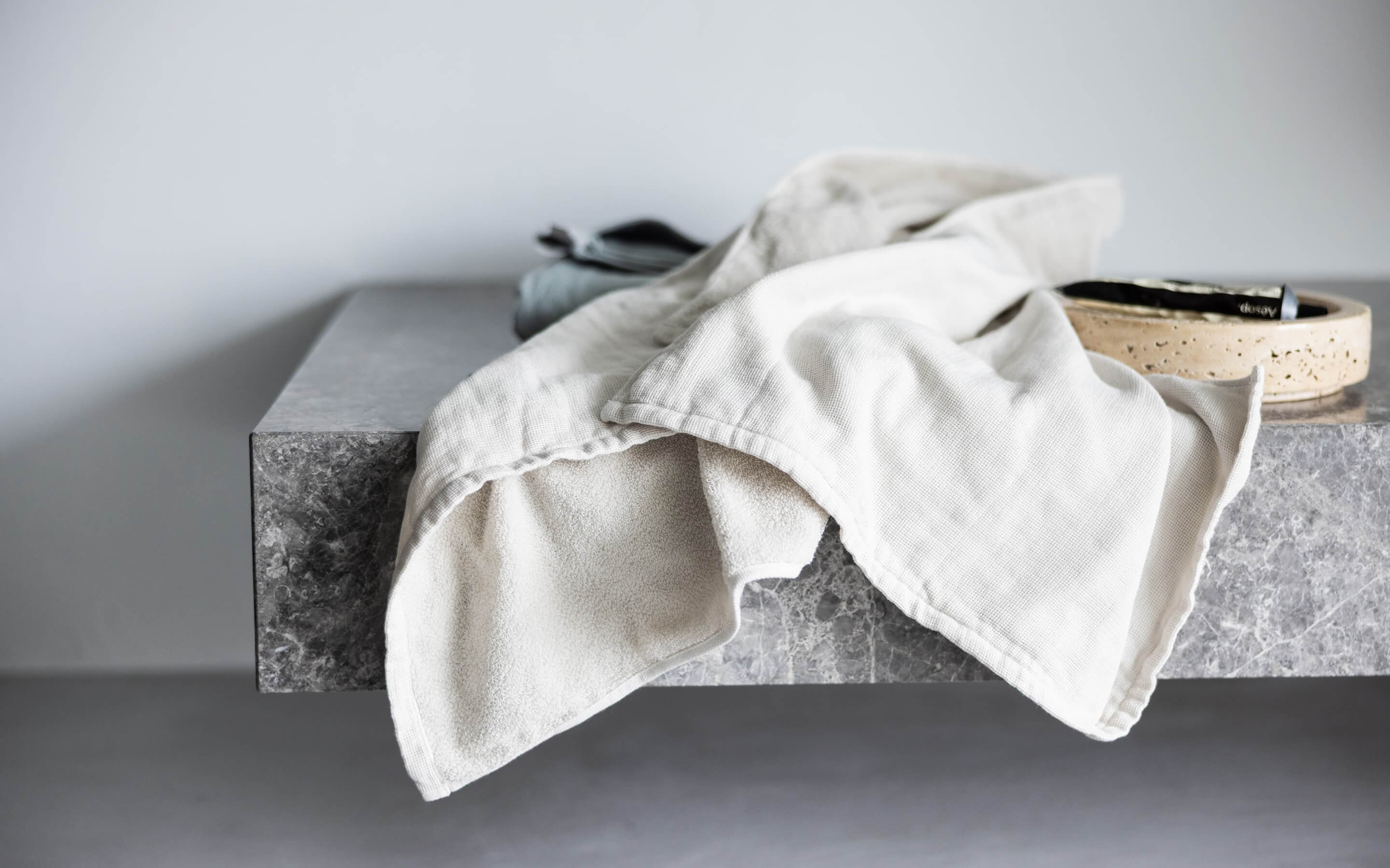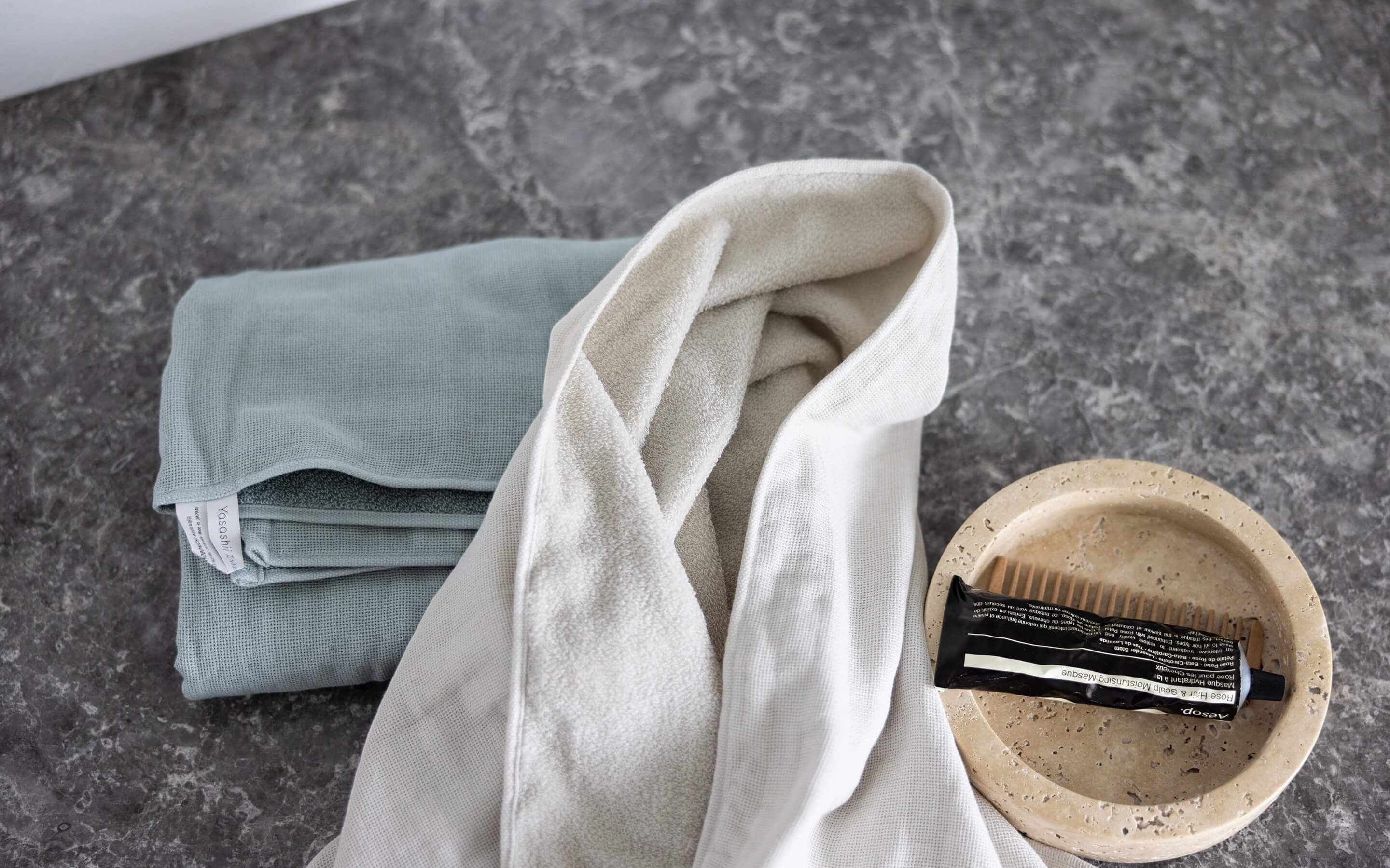 さらりとしたメッシュ状のガーゼを重ねた、2枚仕立てのタオルです。