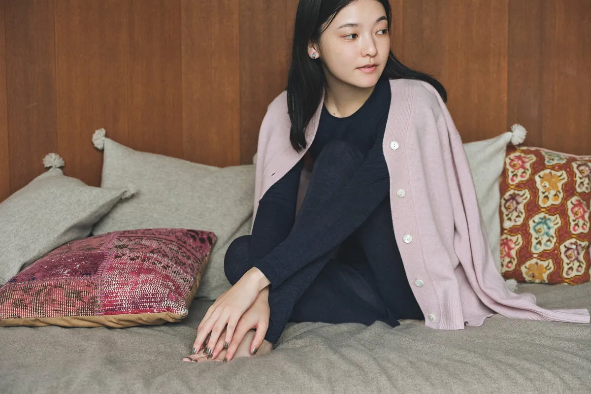 佐久間 混率はEMILY(ネイビー)、SARA(モカ)、 VICTORIA(チャコール)と同じなのですが、 編み方が違うので風合いや着心地がそれぞれ違います。 たとえばSARAは トップスとしても着られるように、 あえて厚めな生地になるように編まれています。 一方でFILIPPAやVICTORIAは インナーとして着ていただくために、 肌あたりのやわらかさを重視して やさしく編まれています。 なので、若干ですが透け感もありますよね。