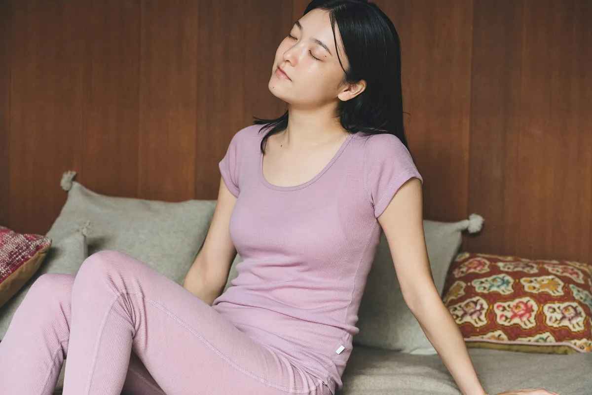 佐久間 お客さまから、こんなお話を聞いたことがあります。 風邪をひいて高熱を出した夜、たくさん汗をかいて、 本来なら着替えなければならない 状況だったそうなんですが、 着替える気力もなく、そのままぐったりしてしまって。 でも、その日はたまたま JOHAをパジャマとして着ていたそうで、 メリノウールの放湿性・速乾性のおかげで、 汗をかいてもべたつきにくく、 寝冷えすることもなかったそうです。 結果的に、着替えずに一晩を乗り越えられた、 とおっしゃっていました。