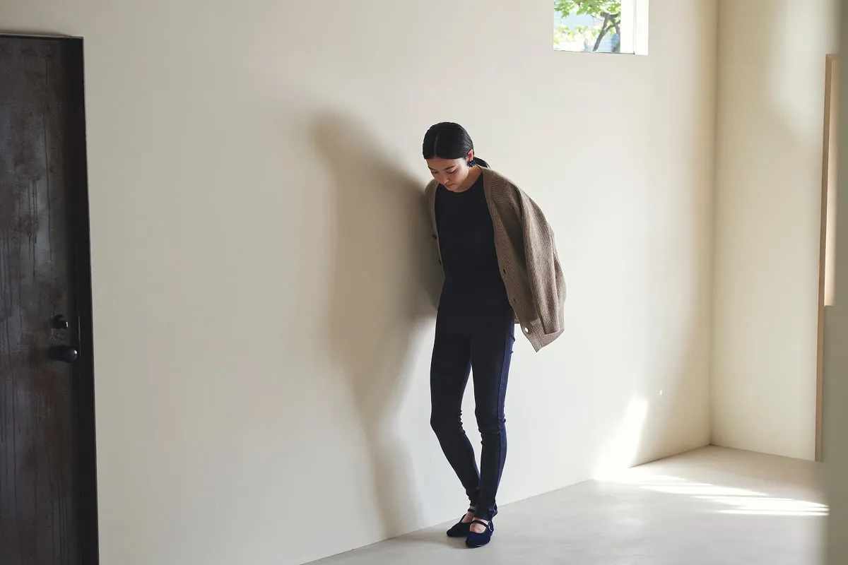 轟木 いろんな種類を持っているんですけど、 特によく着るのは、モカのSARAの ブラウスショートスリーブ、ロングスリーブ、レギンス。 それから、ネイビーのEMILYの ロングスリーブとレギンス。 白いMARIEは3、4枚持っています。 私は白っぽい服をよく着るから、 レギンスをワンピースの下に重ね着しています。 足首がクシュッとなって、 靴の甲に少しかかるくらいのゆとりが好きで。 真っ白すぎない白なのも、 冬の服に合わせやすいんですよね。