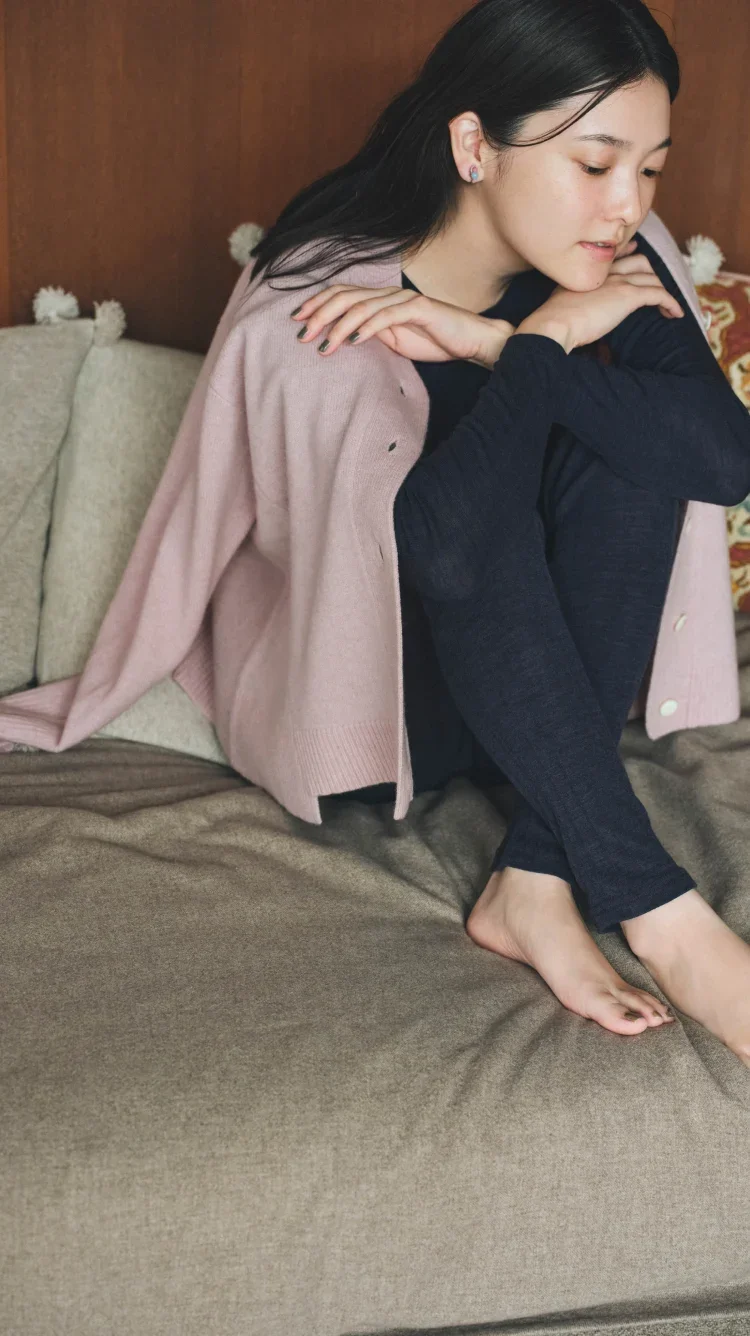 さゆり 洗濯機で洗えるのって、うれしいですよね。 こういう手触りのいいウールのインナーって、 お洗濯を間違えると縮んでしまったり 毛玉が気になったりするけれど、 気兼ねなく洗濯機で洗えるなって思います。