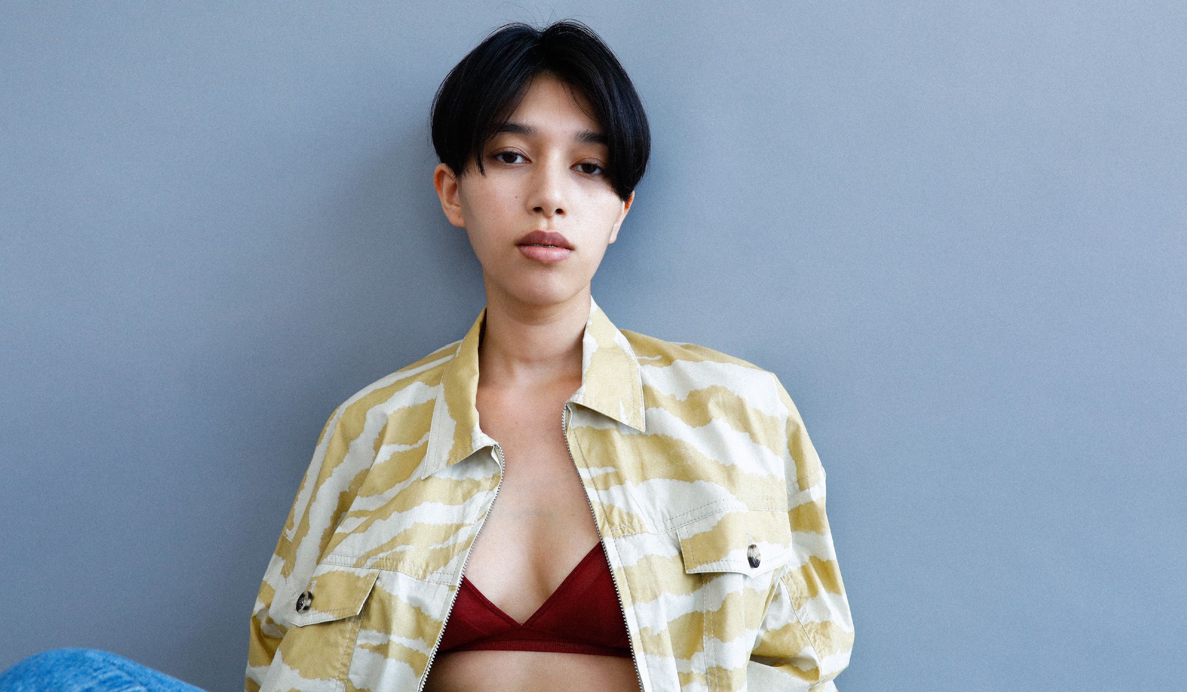 • つきのブラ(チャーム)着用 モデル:Rita(身長171cm) ジャケット¥37,000/アーリー デニムパンツ¥32,000/CINOH(モールド) その他スタイリスト私物