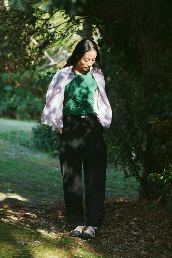 深めの股上で腰まわりはゆったりと、